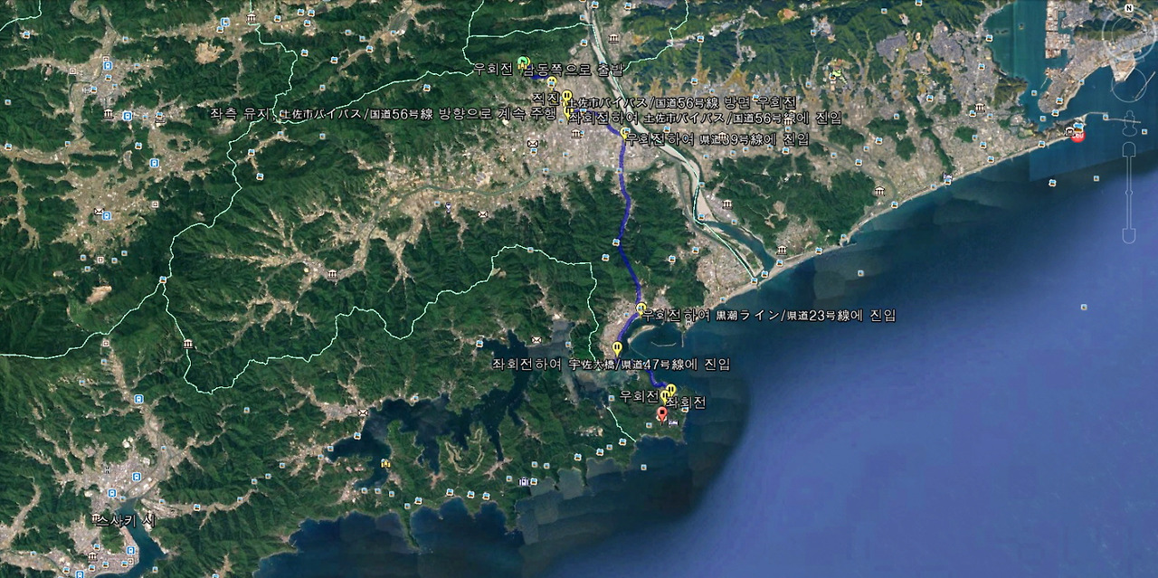 36번 쇼류지(青龍寺)까지는 장장 15킬로에 육박한다. 그런데 이 길이 매력이 넘치고 무엇보다 며칠을 희생(?)해서 묵게 된 국민숙소토사(国民宿舎土佐)가 기다리고 있는 데다 그 토사의 위치 또한 절묘하니 발걸음이 무겁지는 않다. 악어가 태평양을 향해 기어나간 형상을 한 리아스식 해안의 요코나미반도(横浪半島)의 끝자락에 오롯이 높이 올라앉았으니 전망은 말할 것도 없고 시코쿠에선 처음 체험해보는 로텐부로(露天ぶろ)가 기다리고 있다.