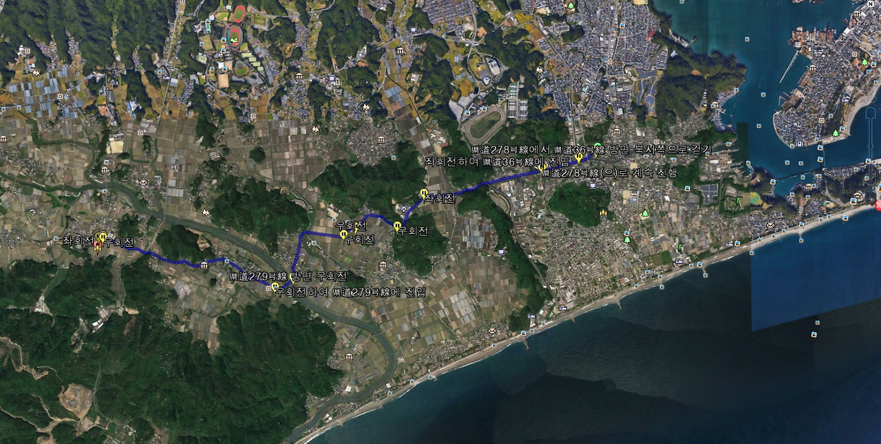 터널을 나오면 태평양에 면한 해안도로를 따라 걷는 길이다. 시코쿠의 정남쪽 해안도로 되시겠는데 이 길도 고치현의 동쪽해안도로만큼이나 맘에 드는 길이다. 그래도 바다색깔은 동쪽 해안에 못미친다. 딱 우리나라의 동해안 남해안과 닮아있는 걸 보면 또 신기하다.