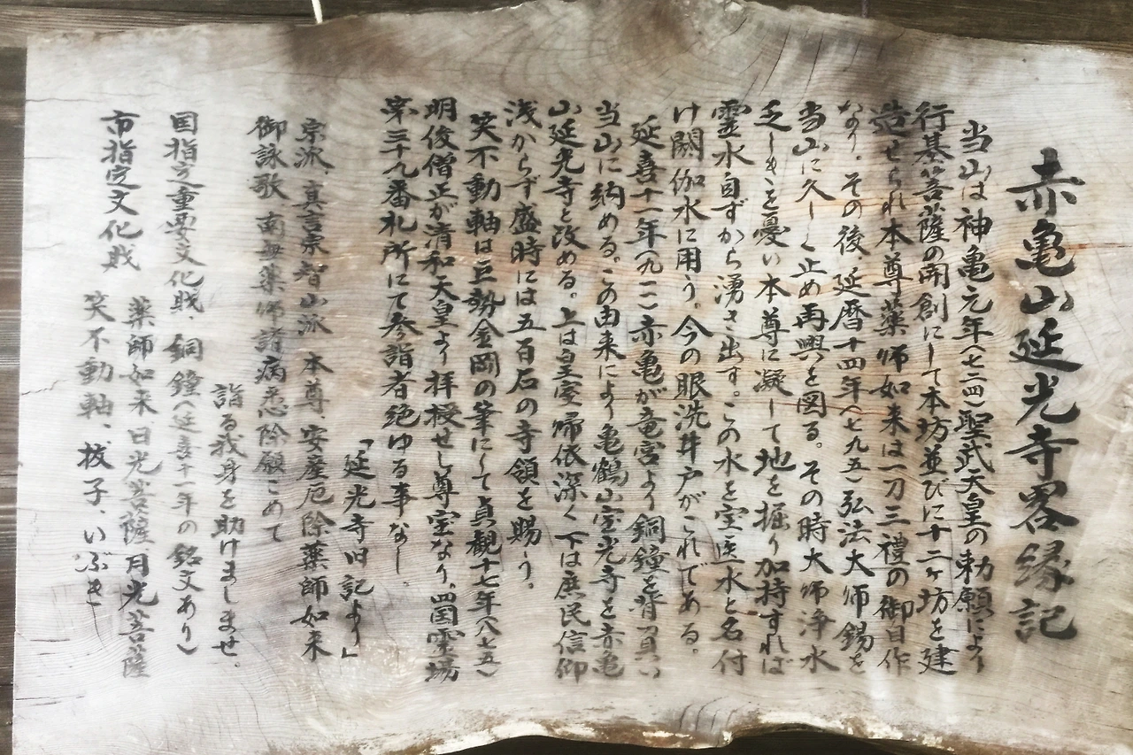 코보대사가 이 절을 찾은 것은 엔랴쿠 연간(782~805)으로 간무 천황(재위781~806)의 칙명에 의한 기원소로 재흥, 일광, 월광 보살상을 안치하고 칠당 가람을 갖췄다. 이때 스님이 석장으로 땅을 짚어서 우러나온 영험한 물이 오늘에 전해지는 '눈 씻는 우물'이다.」