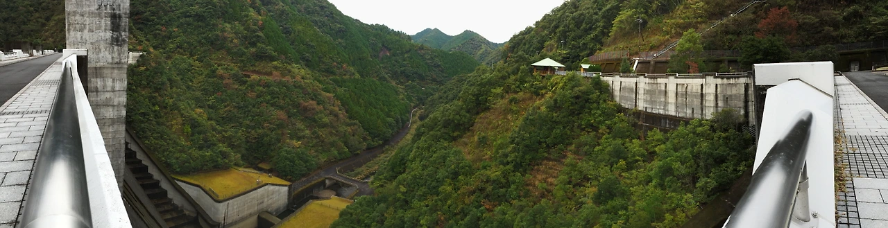 작은 우메노키터널을 지나면 왼쪽으로 저장된 나카스지가와의 물과 멀리 댐이 보인다. 왼쪽으로 직진하면 바로 댐이 나오고, 오른쪽엔 댐에 딸린 공원 전망대가 있다. 일단 전망대 위로 올라서 댐을 내려다보는 재미도 쏠쏠한데 문제는 내려가는 길이다. 댐으로 바로 연결되는 계단의 입구는 나무 사다리모양의 문으로 막혀있고, 올라온 길을 다시 내려가서 돌아가는 길은 너무 멀다. 배낭만 아니라면 돌아가는 길도 문제 없으련만 배낭을 핑게로 공중도덕을 잘 지키는 일본인들은 하지 않을 행동, 월담을 넘고 만다. 다행이 주변에는 아무도 없다.
