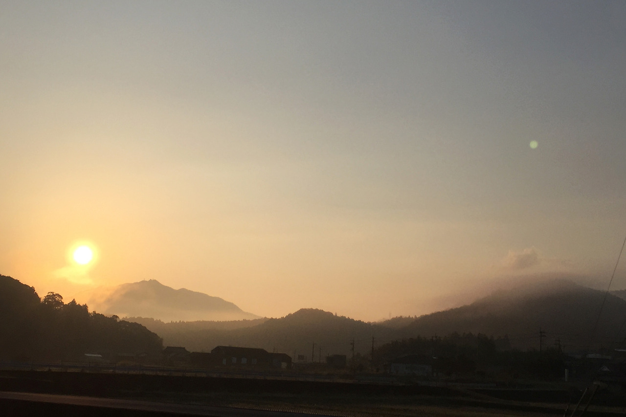 엔코지 뒷편의 멀리 보이는 산 위로 솟아오르는 일출이 따뜻한 빛을 쏘아준다.
