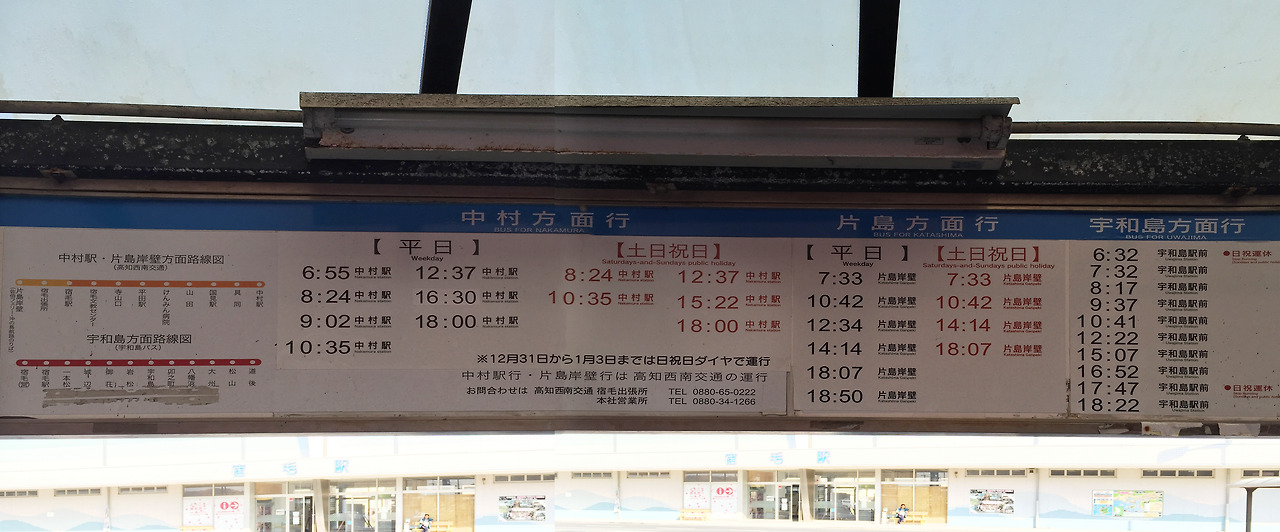 약 8킬로 거리의 스쿠모역(宿毛駅)까지만 걸어가서 버스를 타고 우와지마까지, 우와지마에서 기차로 마츠야마역까지 간 후에 공항가는 리무진버스를 타면 될게다.