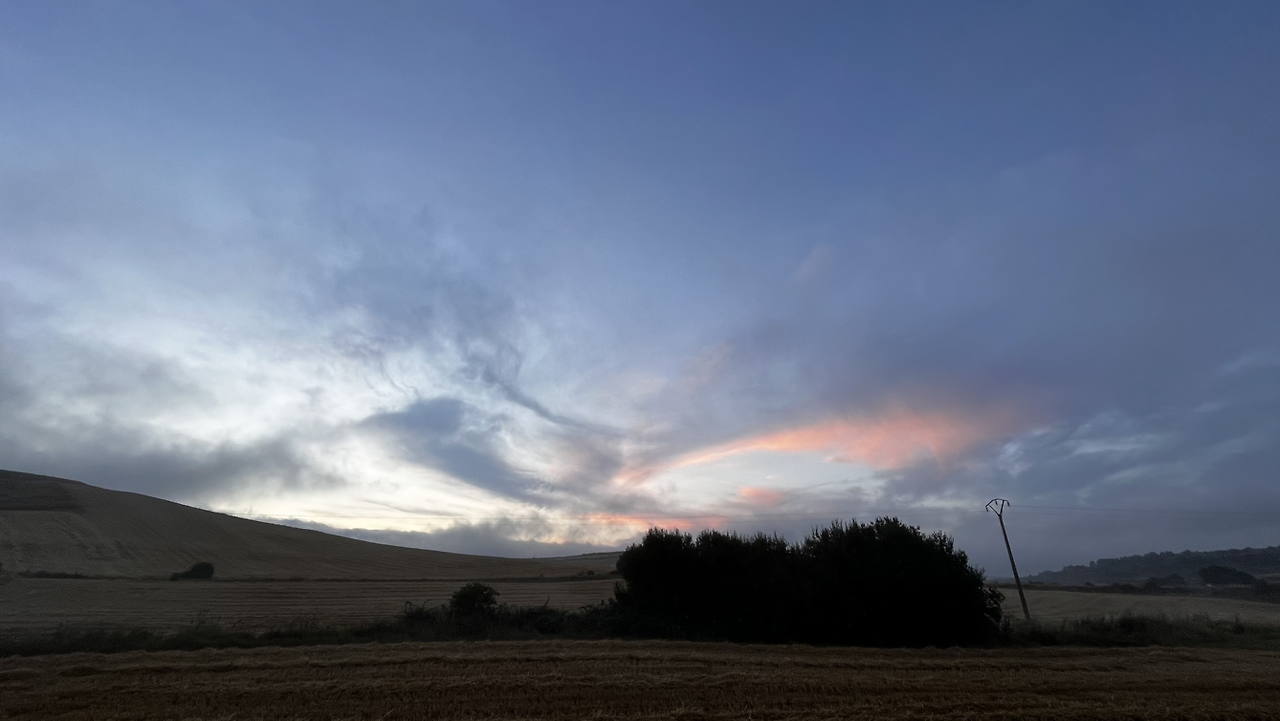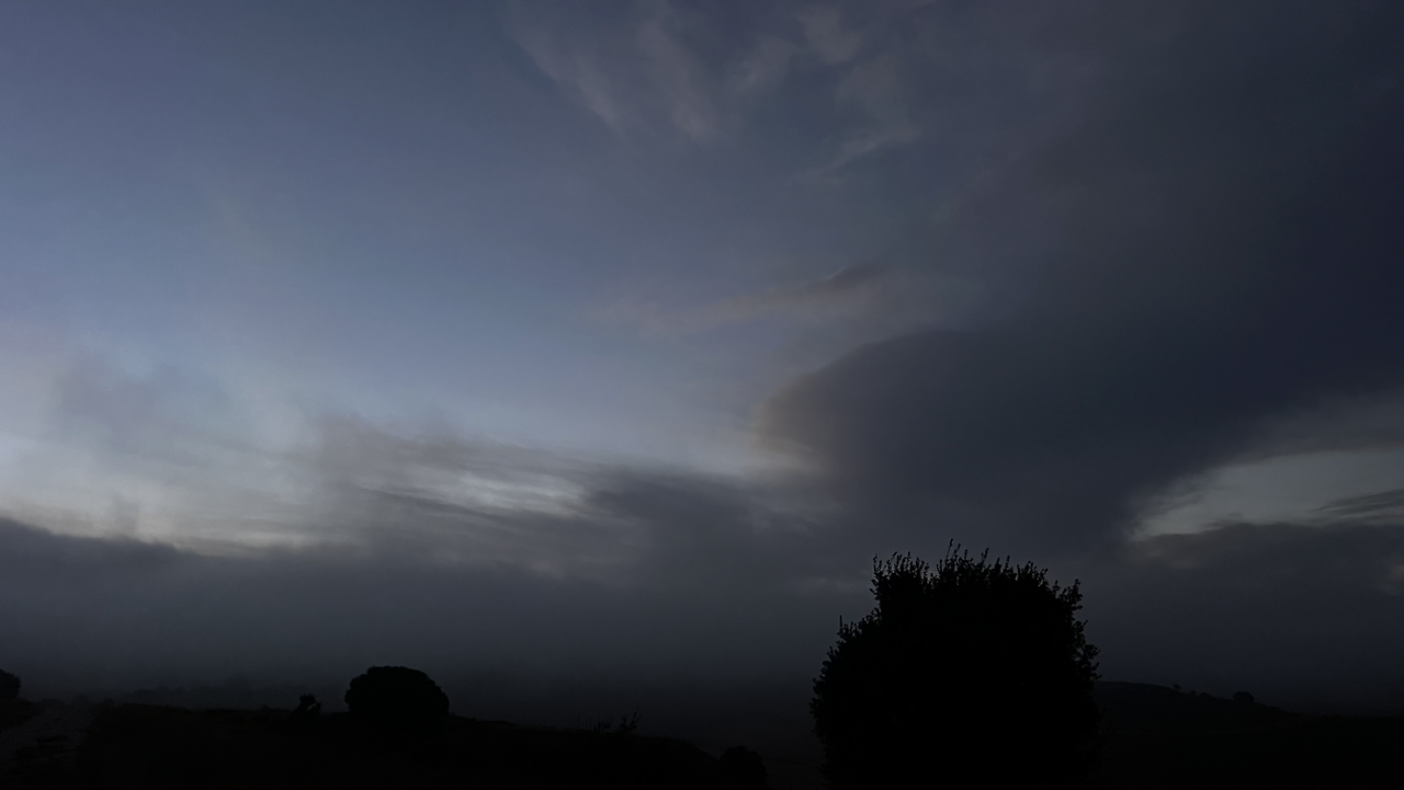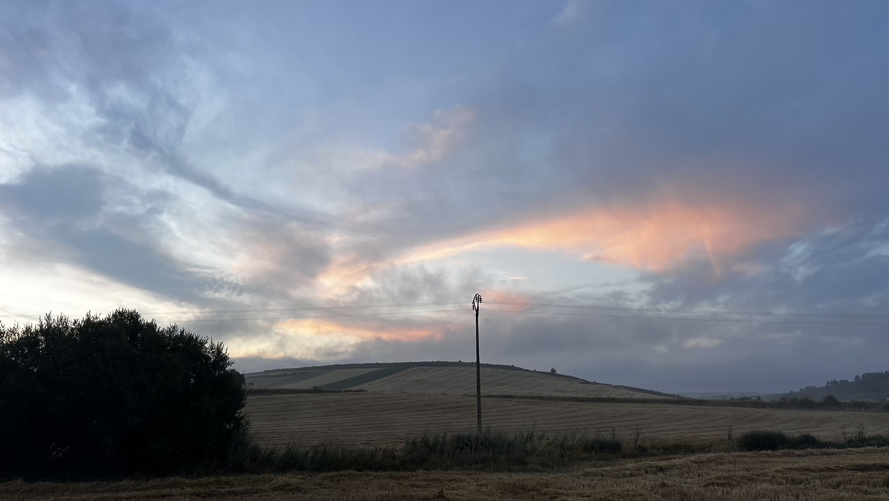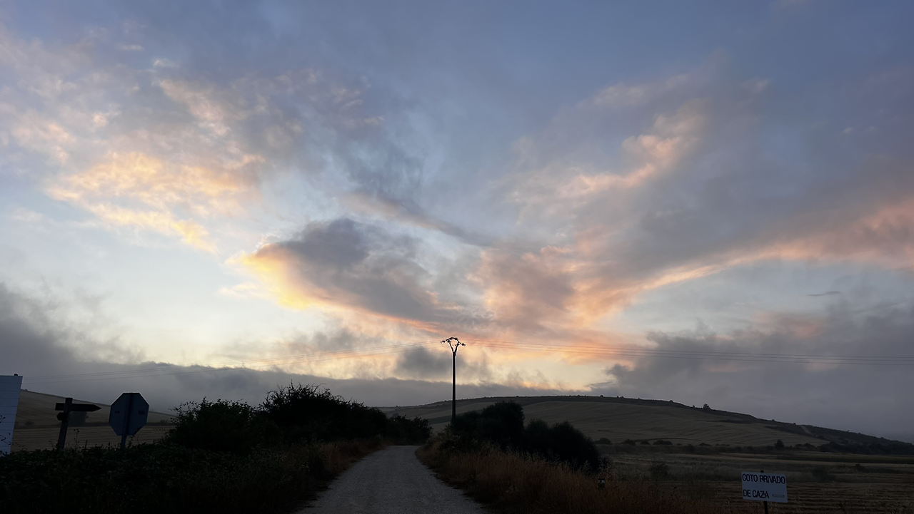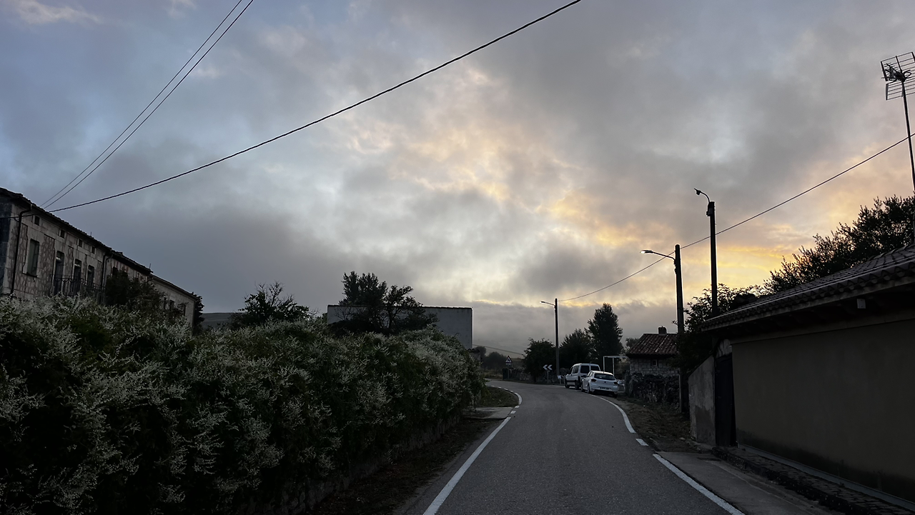 이 남자 나보다 과묵해서 할 수없이 통성명을 시도하니 이태리에서 온 스테파노라고 한다. 까미노에서 몇번 마주쳤을 때는 독일 남자일거야 생각했는데 의외로 이탈리아노란다. 같이 걸으니 랜턴도 둘로 더 밝아지고 길잃을 염려도 없어서 좋다고 한다. 나도 물론 산길을 둘이 걸으니 든든했지만 여명이 밝아오는 시점에서 하늘이 범상치 않길래 나는 천천히 갈테니 먼저 가라고 하고선 스마트폰일망정 사진 삼매경에 빠졌다.