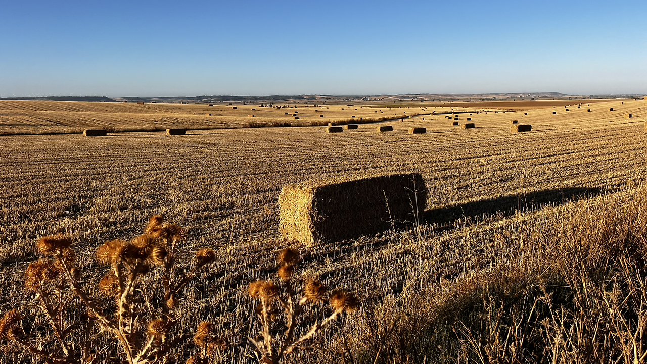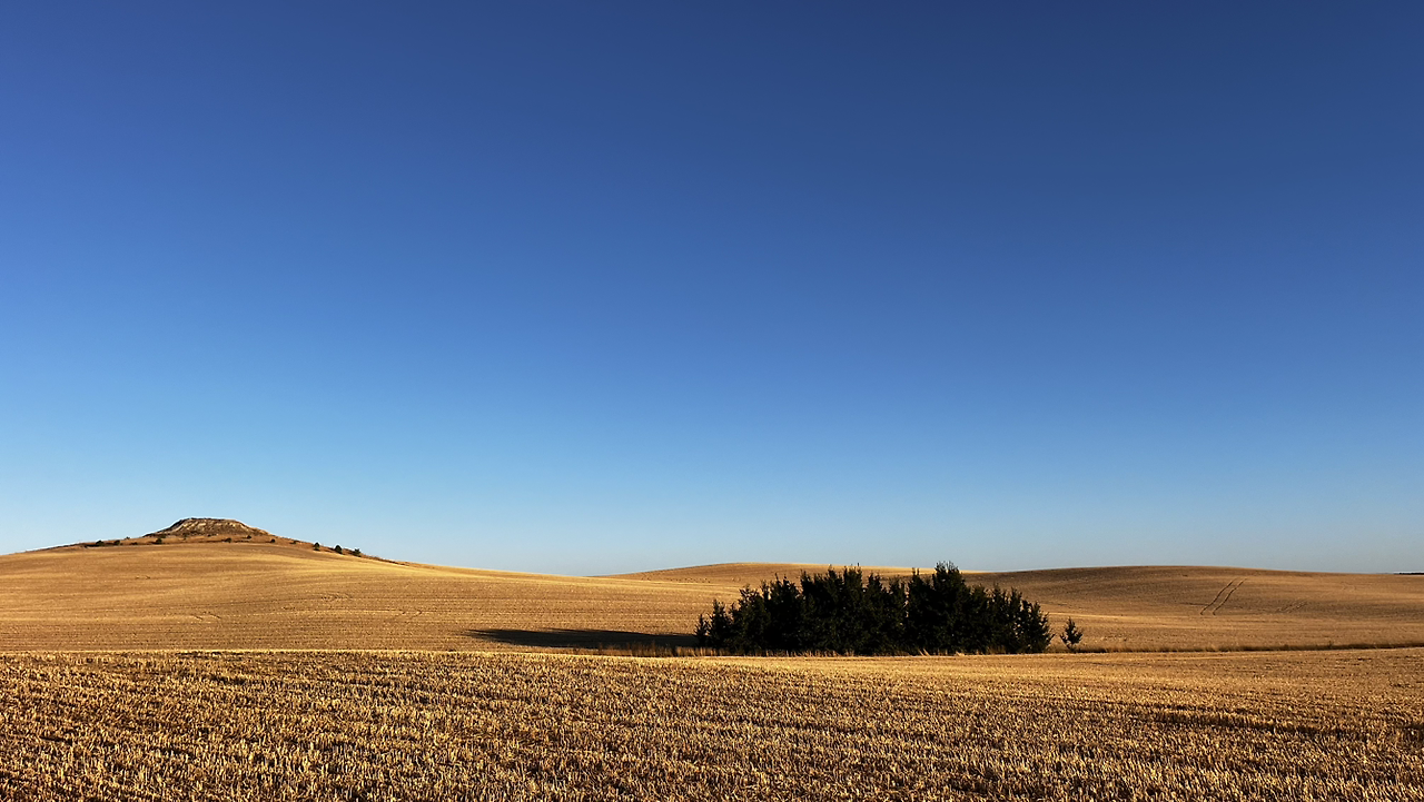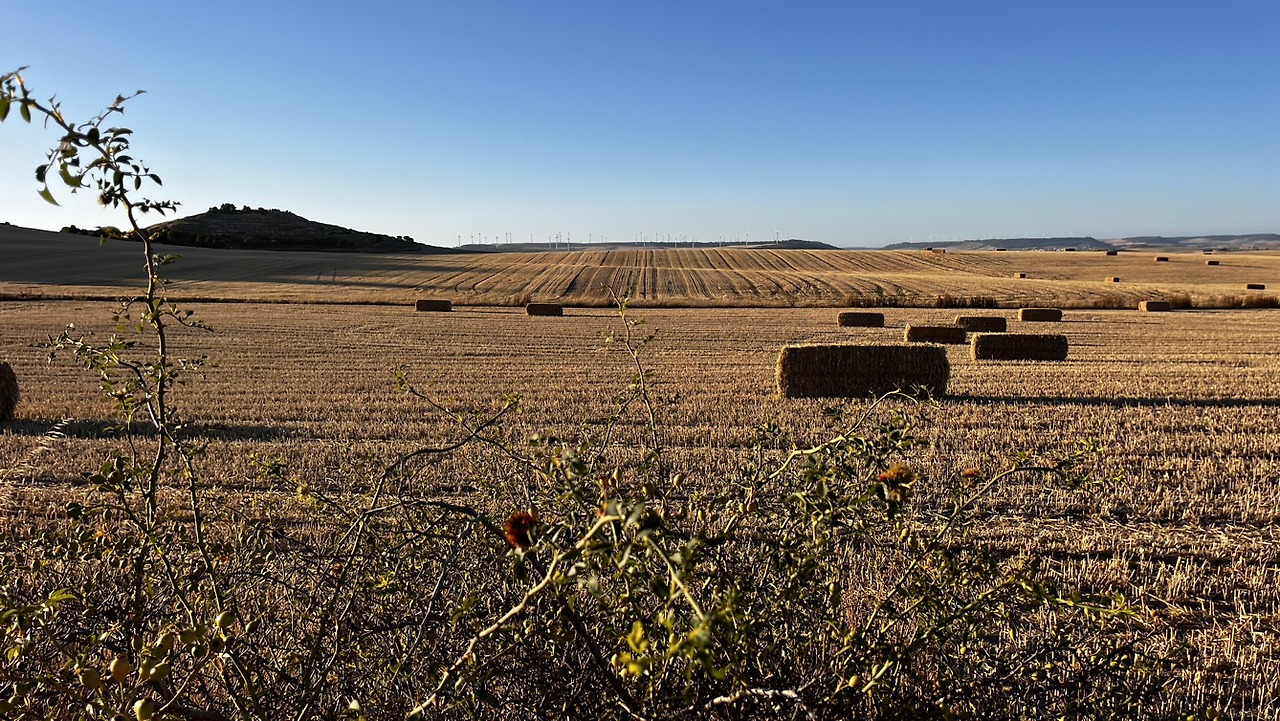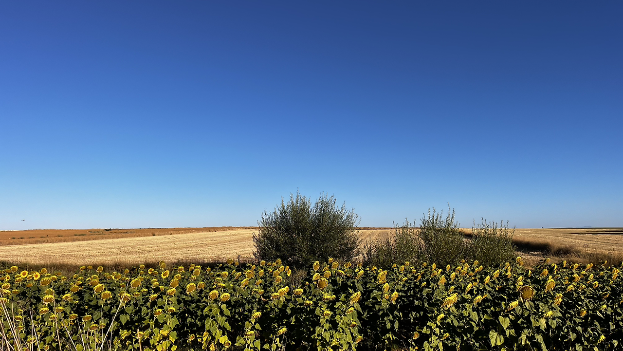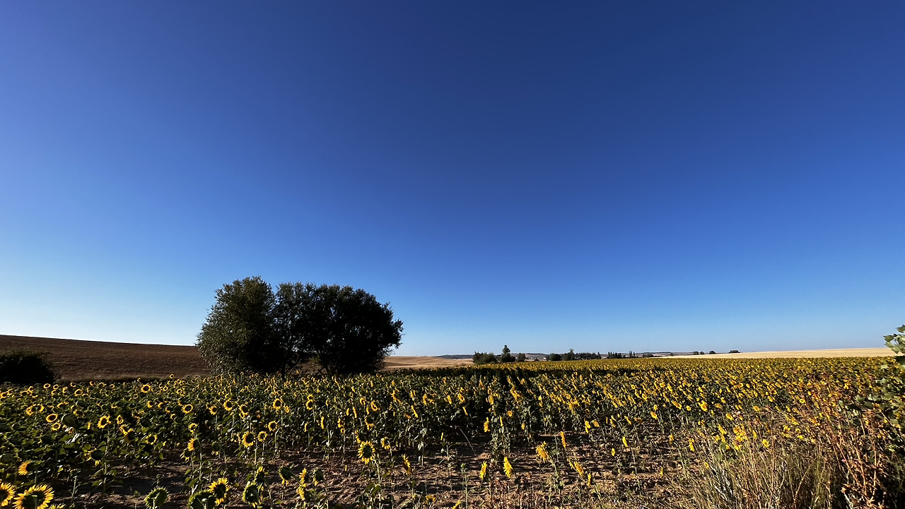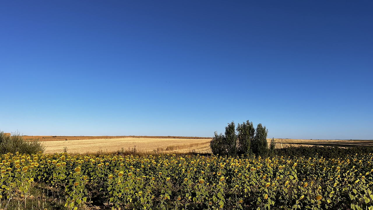 여명이 튼 이후의 황금빛 들녁을 감상하며 다시 까미노에 오른다. 양옆으로 펼쳐진 들녁에 어젯밤 화성인이 다녀가면서 네모난 응가를 해놓은듯한 건초더미들조차 신비롭게 보인다. 간혹가다 왕따나무가 있고 간혹가다 해바라기밭도 있다.