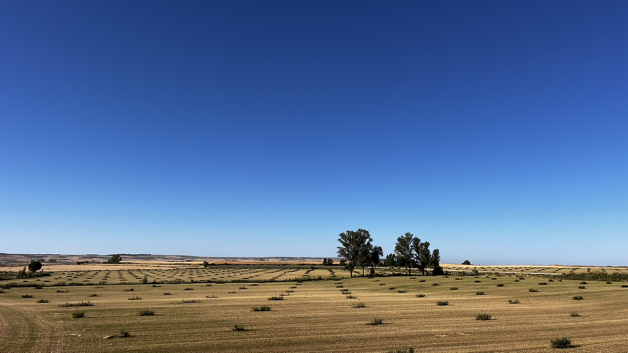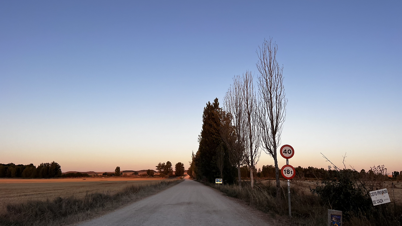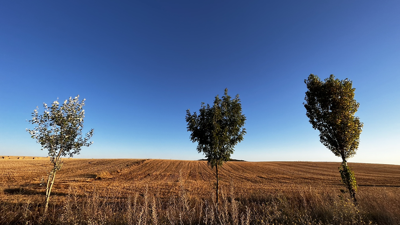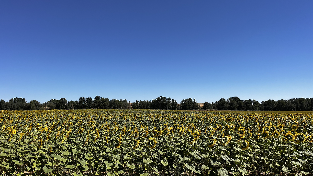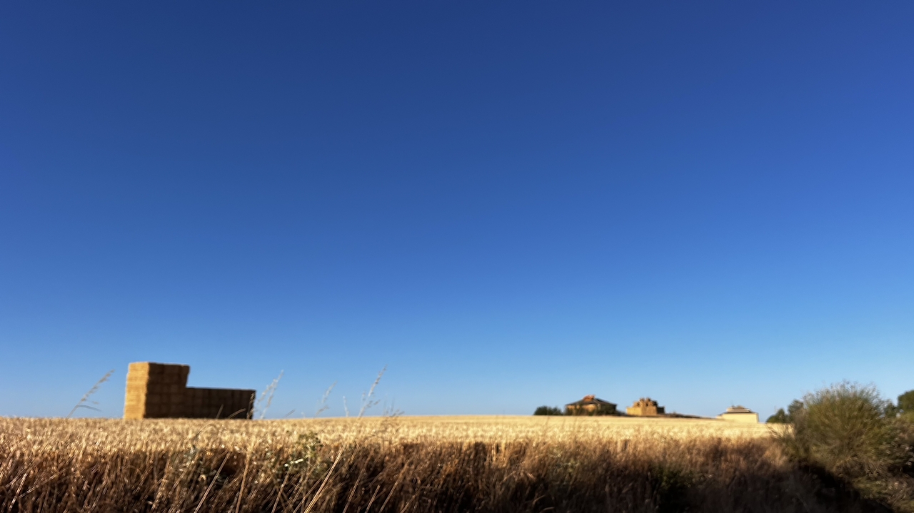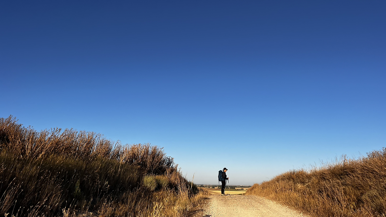 여명이 튼 이후의 황금빛 들녁을 감상하며 다시 까미노에 오른다. 양옆으로 펼쳐진 들녁에 어젯밤 화성인이 다녀가면서 네모난 응가를 해놓은듯한 건초더미들조차 신비롭게 보인다. 간혹가다 왕따나무가 있고 간혹가다 해바라기밭도 있다.