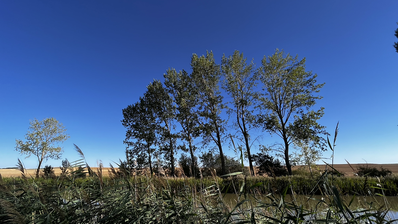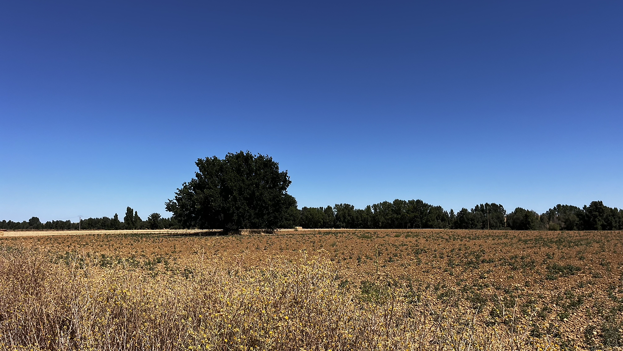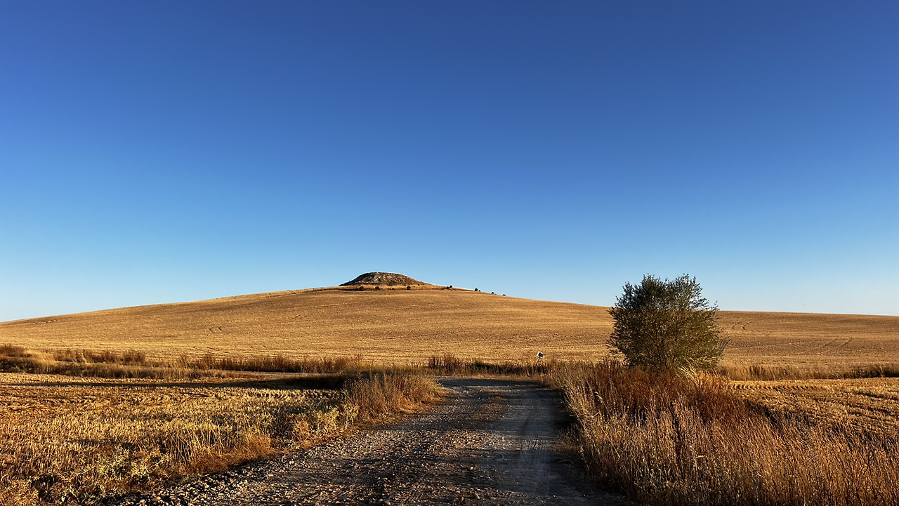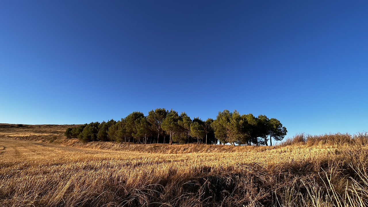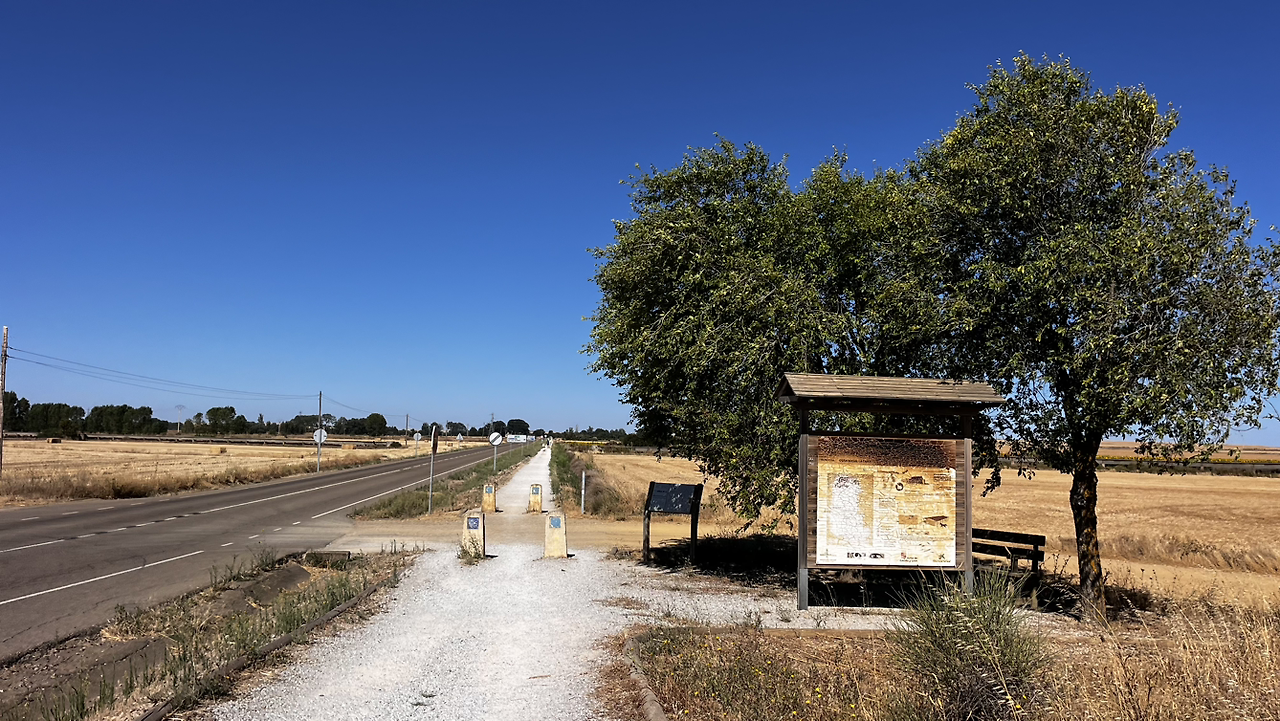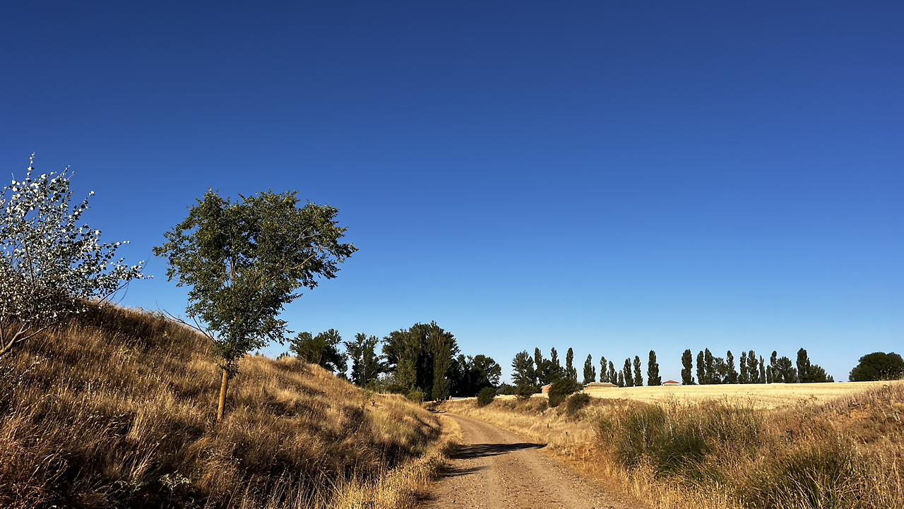 여명이 튼 이후의 황금빛 들녁을 감상하며 다시 까미노에 오른다. 양옆으로 펼쳐진 들녁에 어젯밤 화성인이 다녀가면서 네모난 응가를 해놓은듯한 건초더미들조차 신비롭게 보인다. 간혹가다 왕따나무가 있고 간혹가다 해바라기밭도 있다.