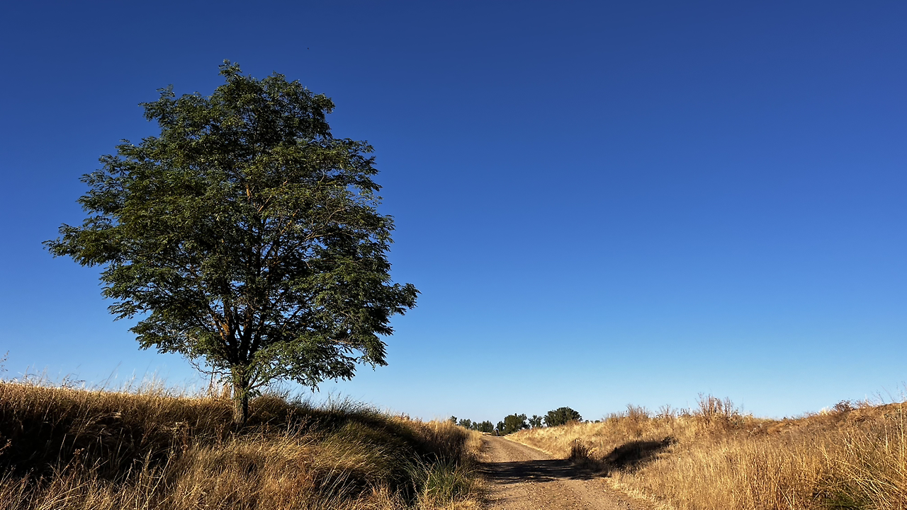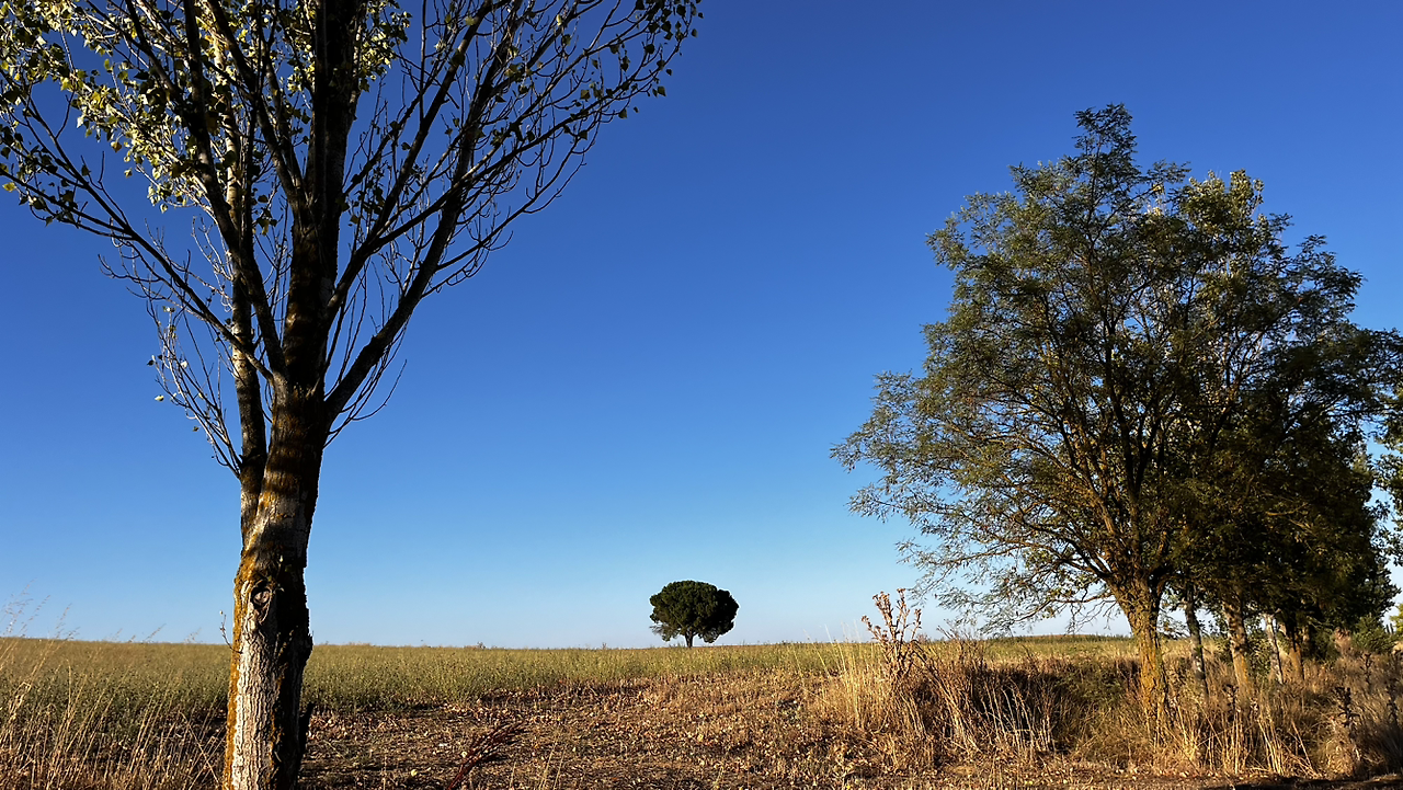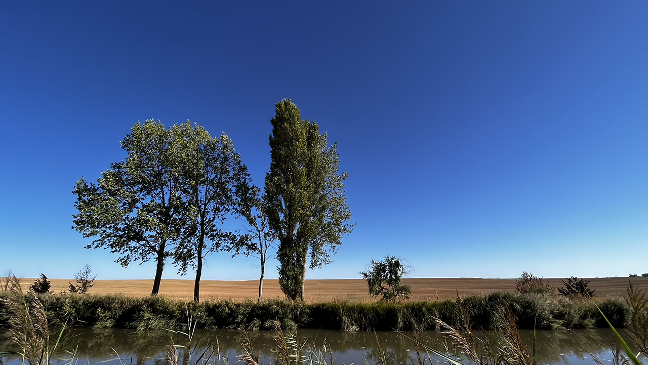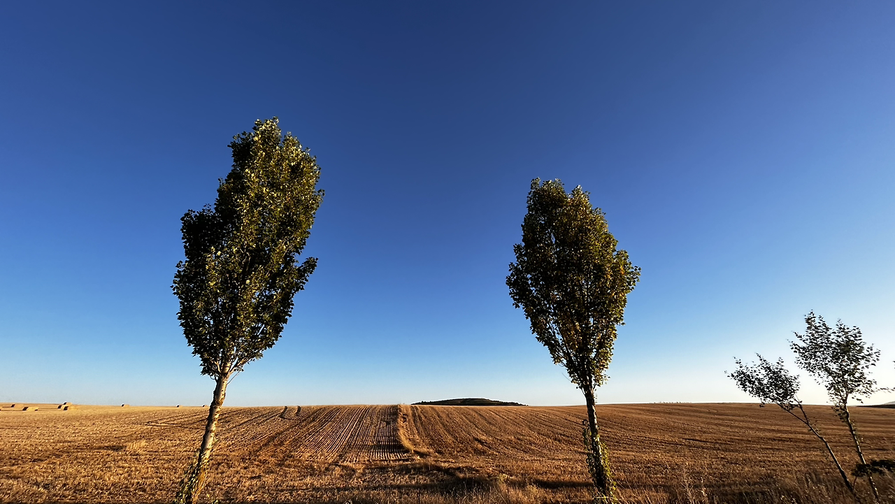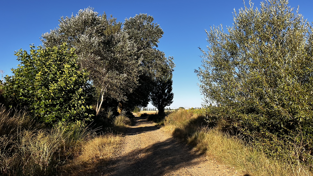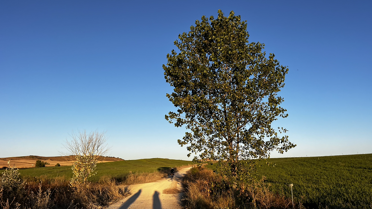 여명이 튼 이후의 황금빛 들녁을 감상하며 다시 까미노에 오른다. 양옆으로 펼쳐진 들녁에 어젯밤 화성인이 다녀가면서 네모난 응가를 해놓은듯한 건초더미들조차 신비롭게 보인다. 간혹가다 왕따나무가 있고 간혹가다 해바라기밭도 있다.