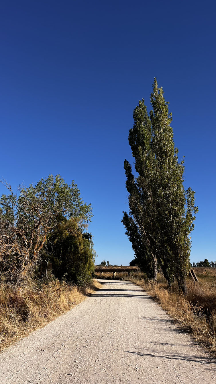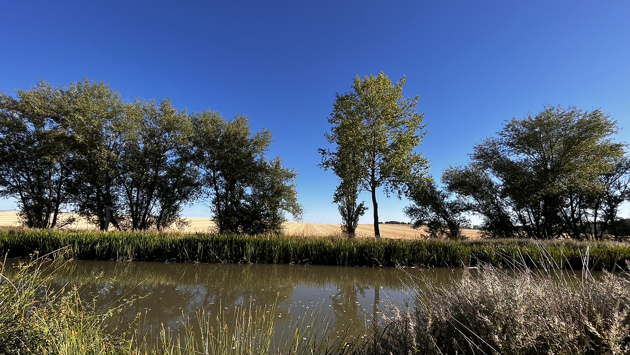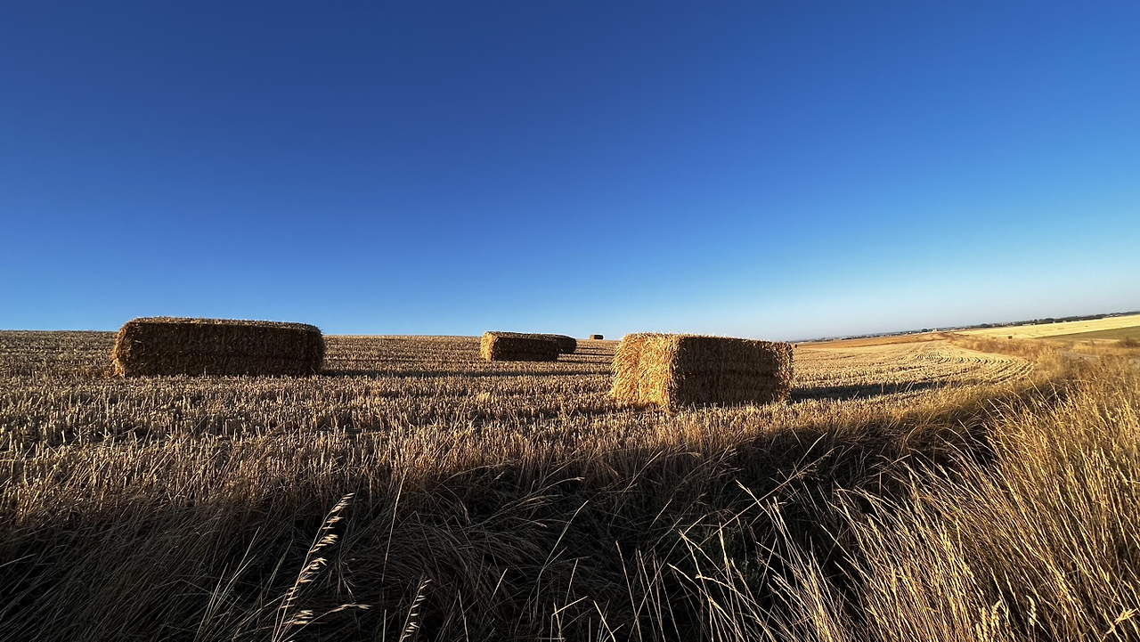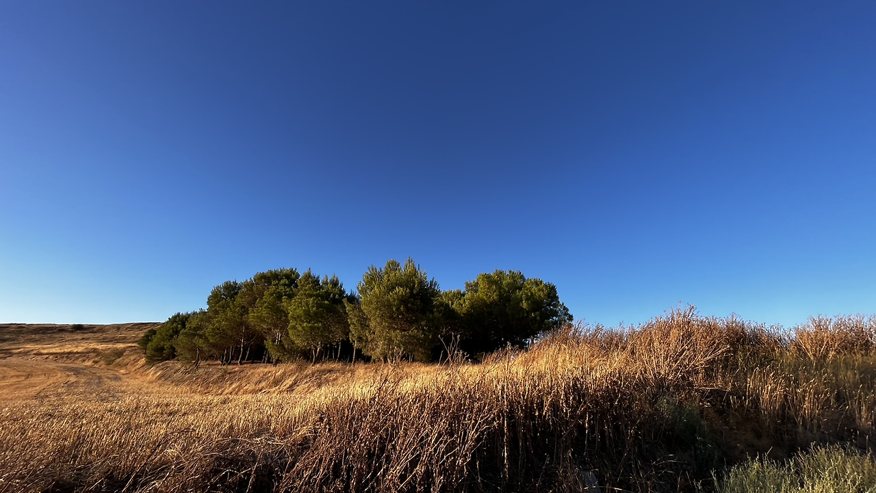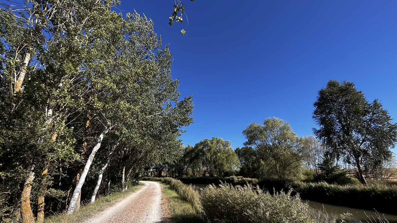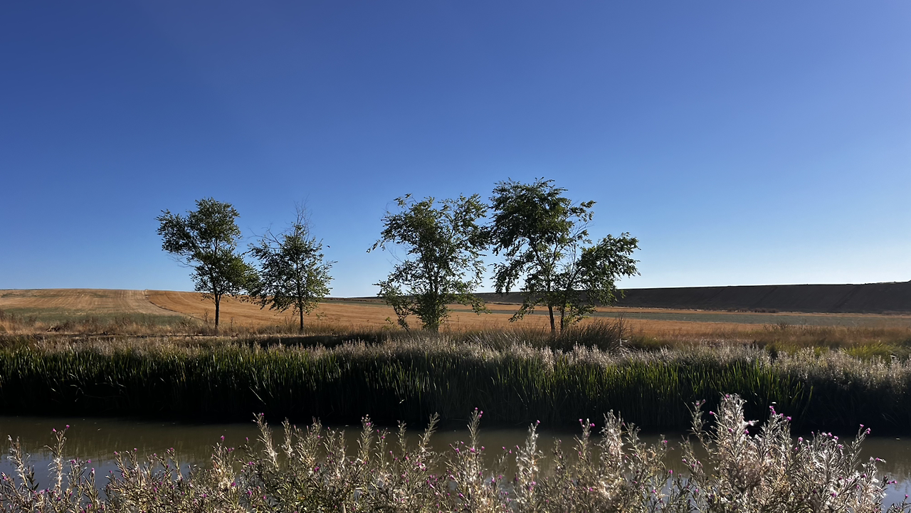 여명이 튼 이후의 황금빛 들녁을 감상하며 다시 까미노에 오른다. 양옆으로 펼쳐진 들녁에 어젯밤 화성인이 다녀가면서 네모난 응가를 해놓은듯한 건초더미들조차 신비롭게 보인다. 간혹가다 왕따나무가 있고 간혹가다 해바라기밭도 있다.