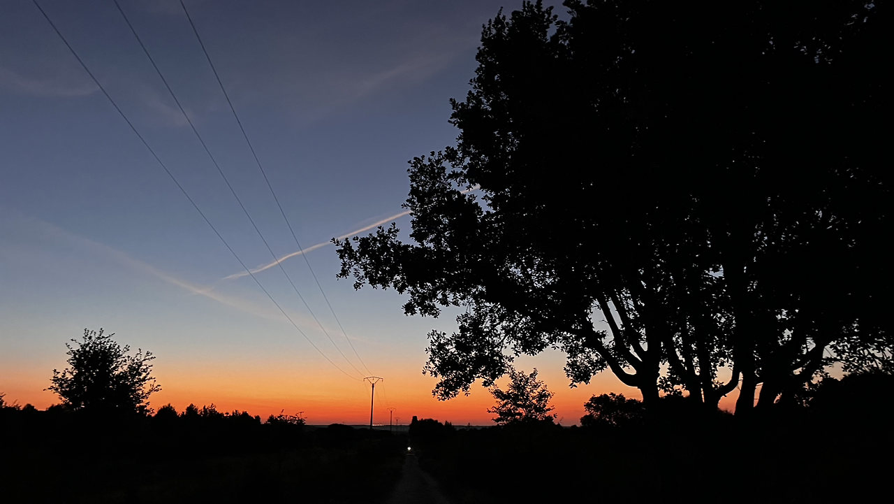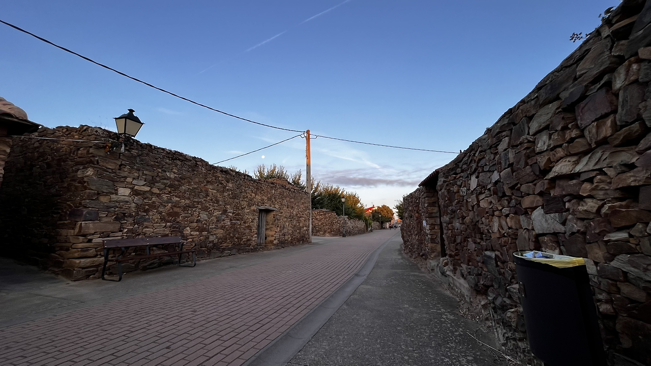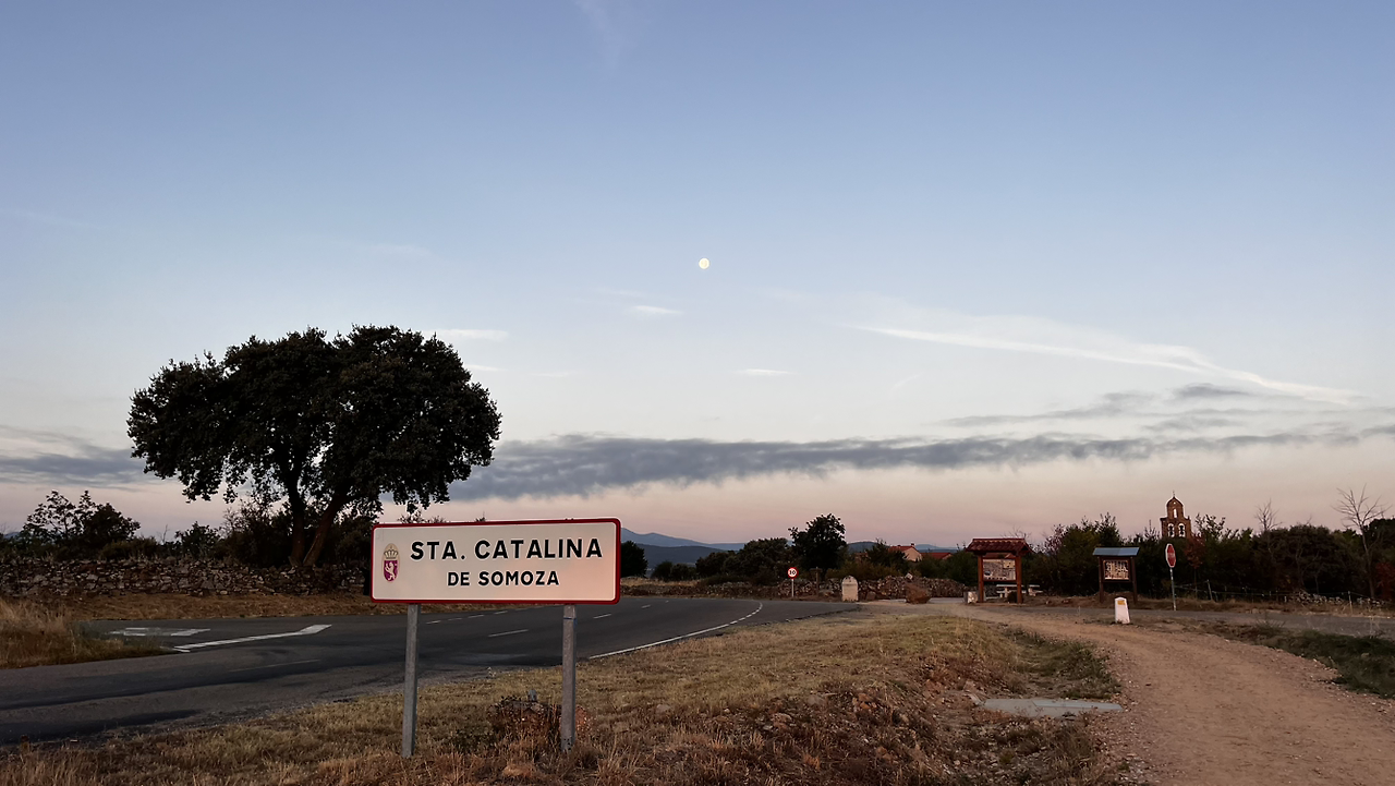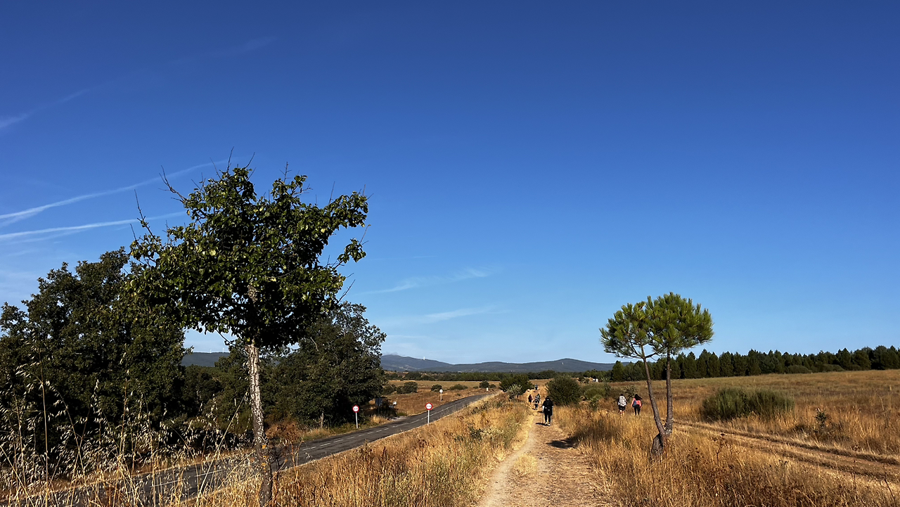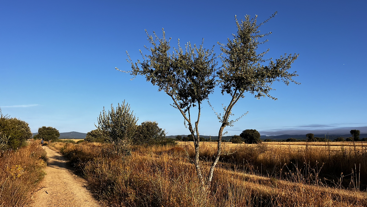 동틀 무렵에 보니 풍경은 딴판이다. 이젠 메세타평원을 완전히 벗어나서 어느새 레온산맥이 성큼 주변을 차지하고 있다. 시골풍경도 황토빛 토지에 나무와 잡풀들이 이제는 한풀 꺾인 더위와 어쩌면 금방 덮쳐올 겨울처럼 한기를 내뿜고 있다.