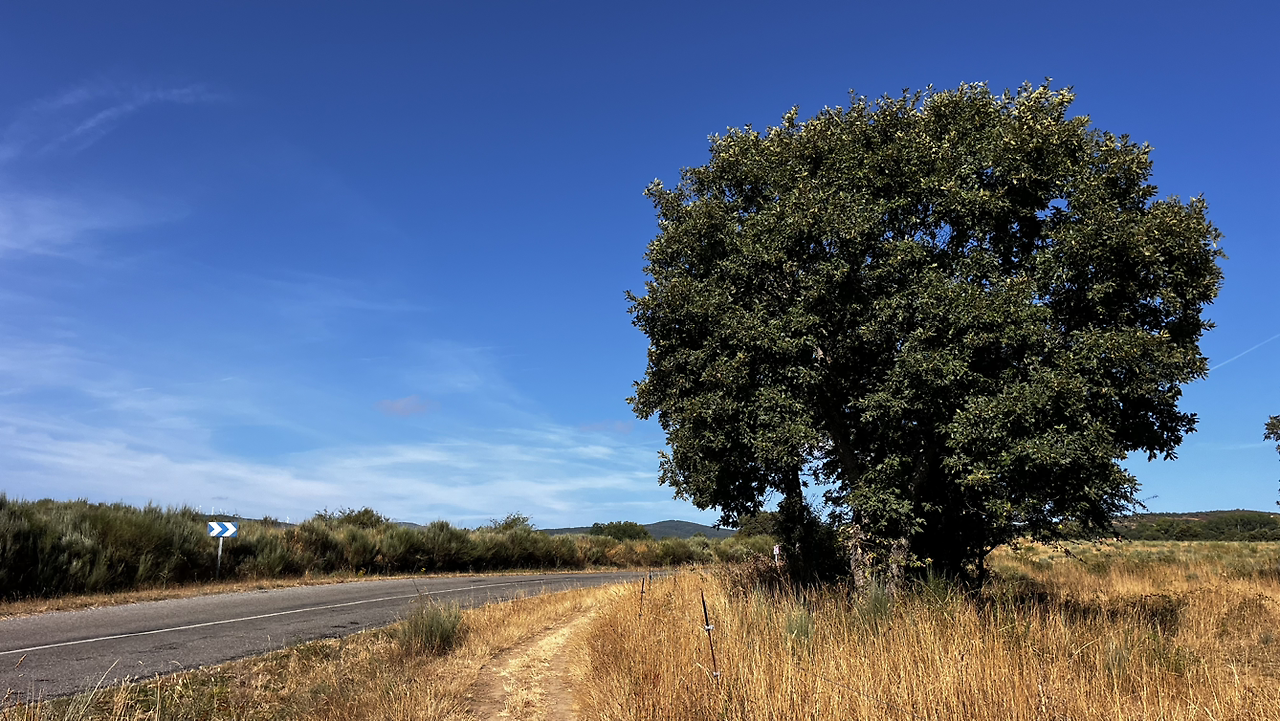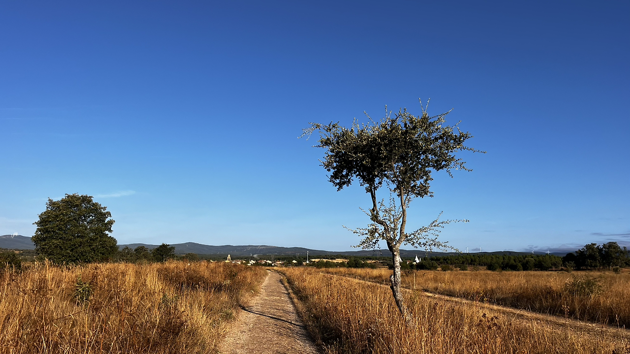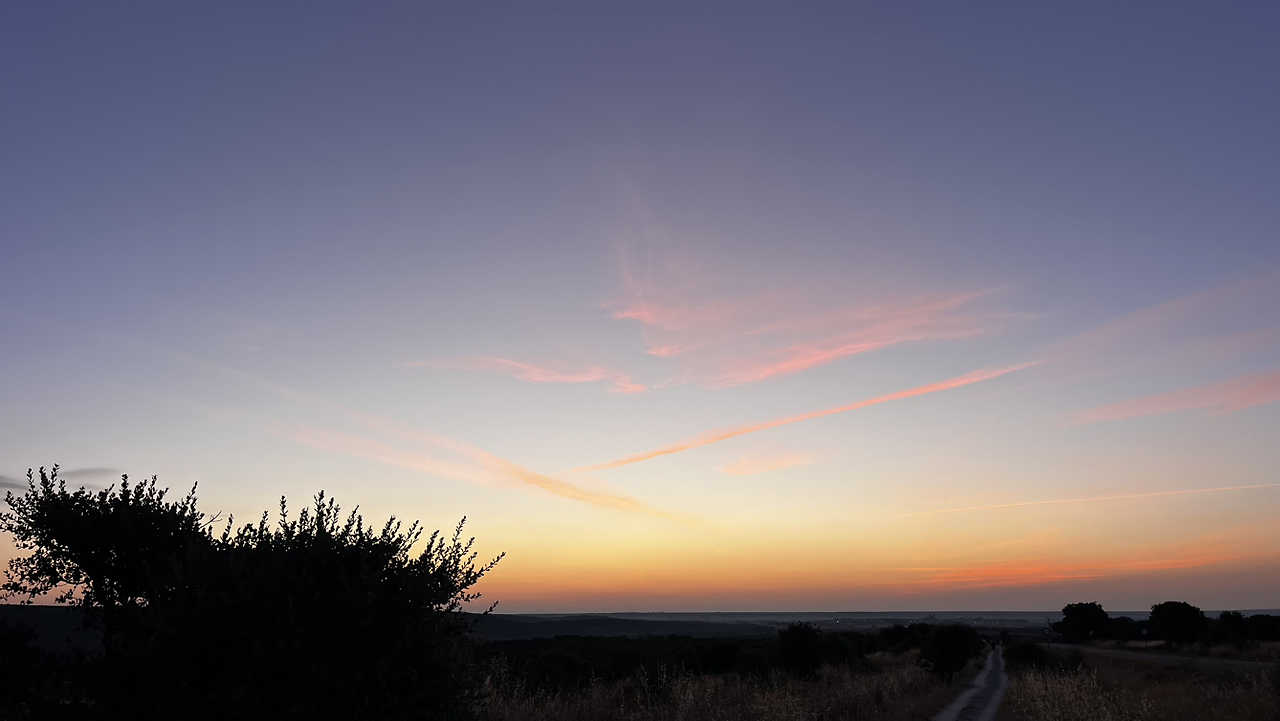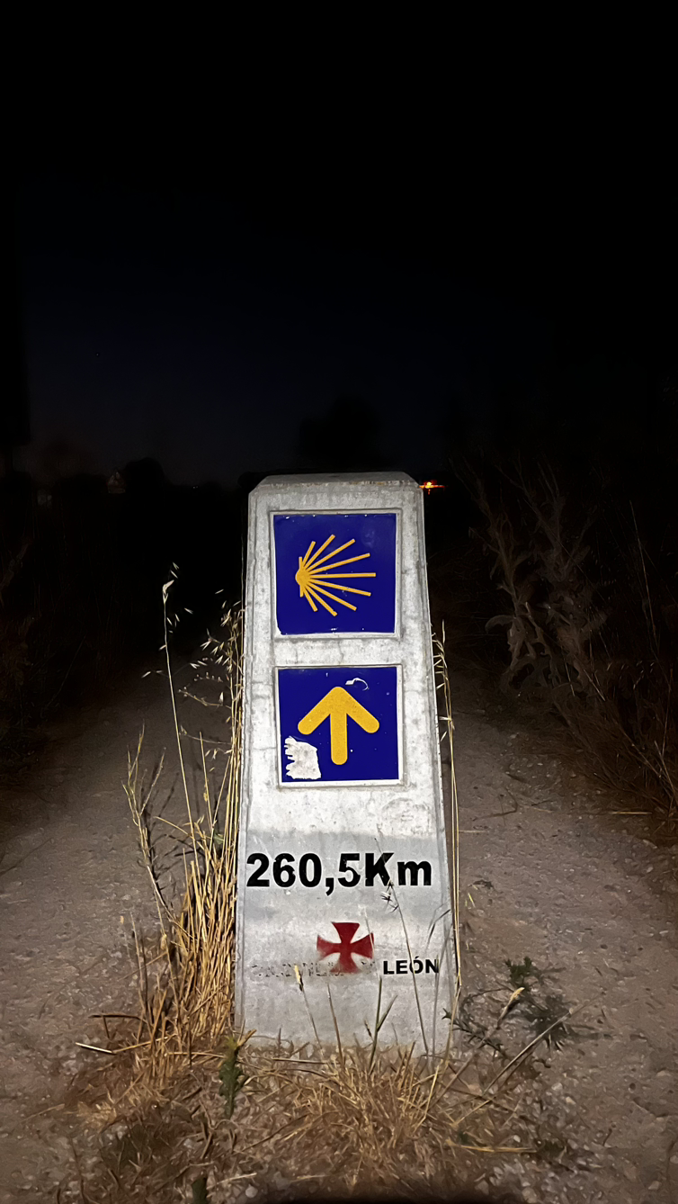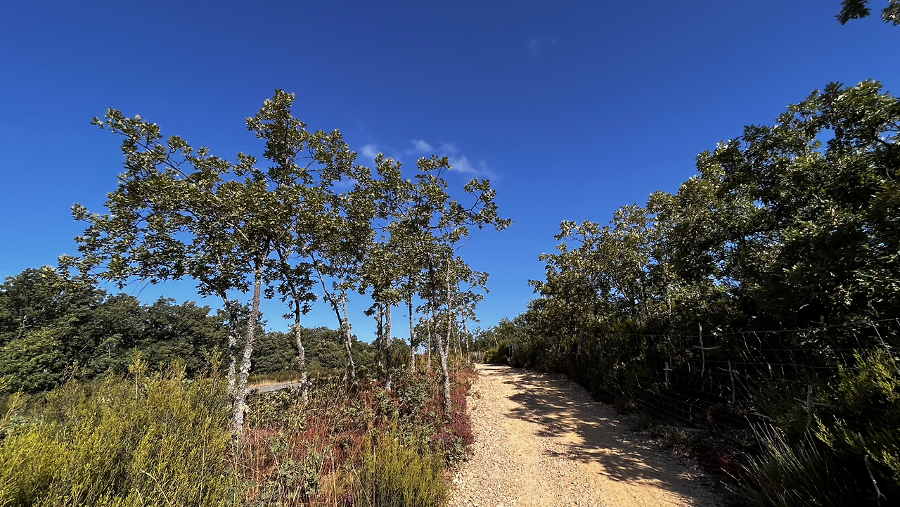 동틀 무렵에 보니 풍경은 딴판이다. 이젠 메세타평원을 완전히 벗어나서 어느새 레온산맥이 성큼 주변을 차지하고 있다. 시골풍경도 황토빛 토지에 나무와 잡풀들이 이제는 한풀 꺾인 더위와 어쩌면 금방 덮쳐올 겨울처럼 한기를 내뿜고 있다.