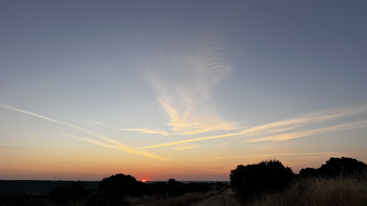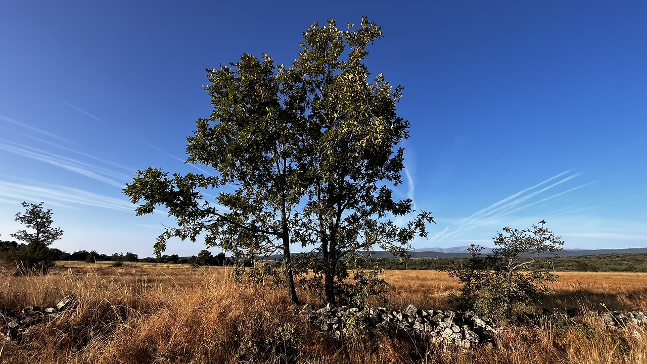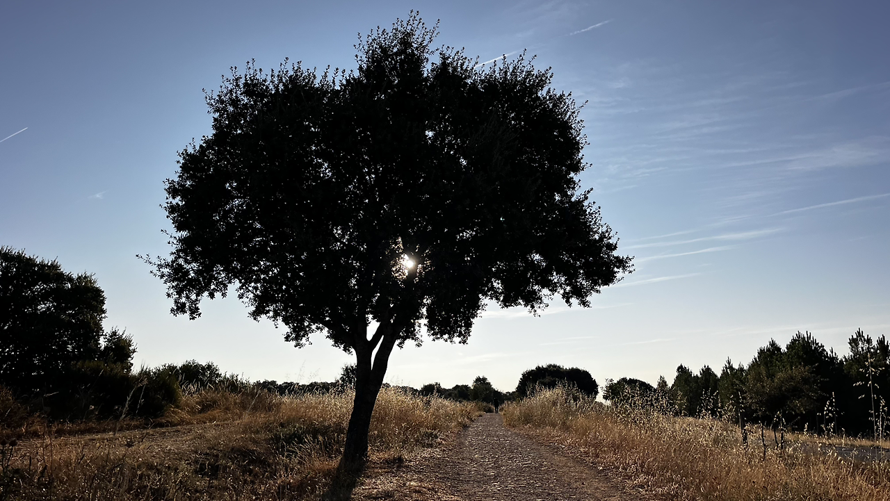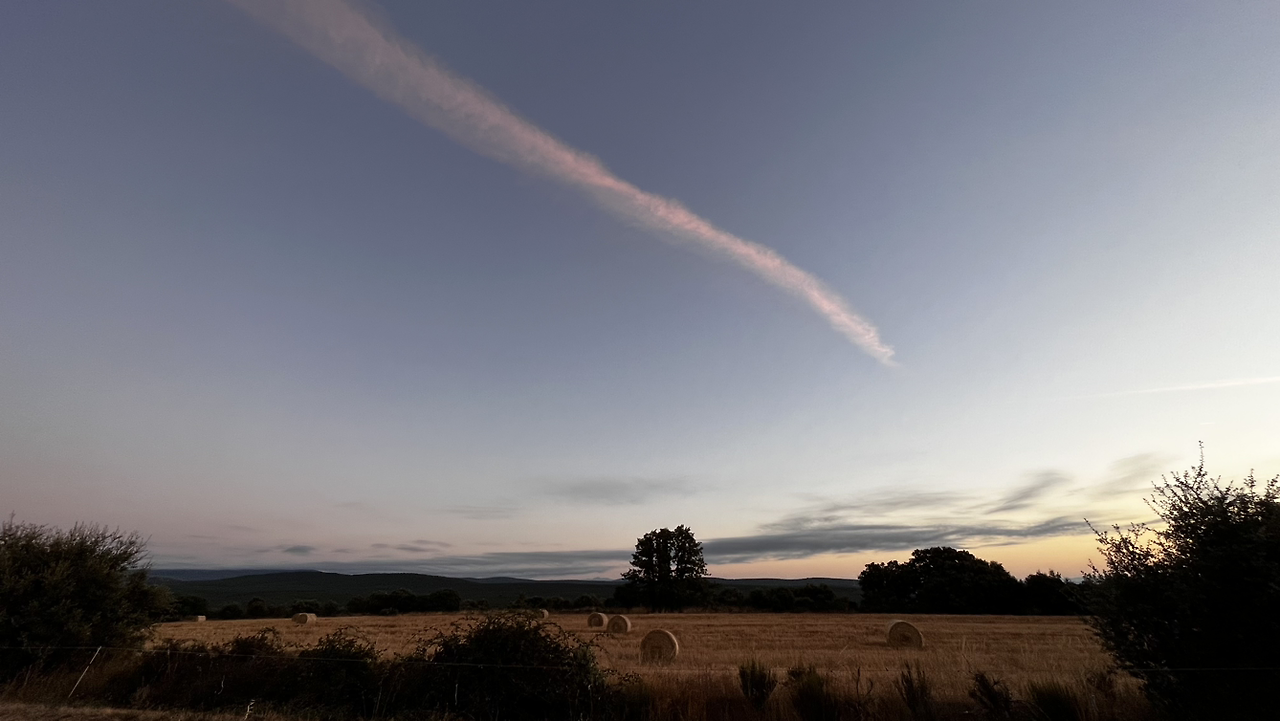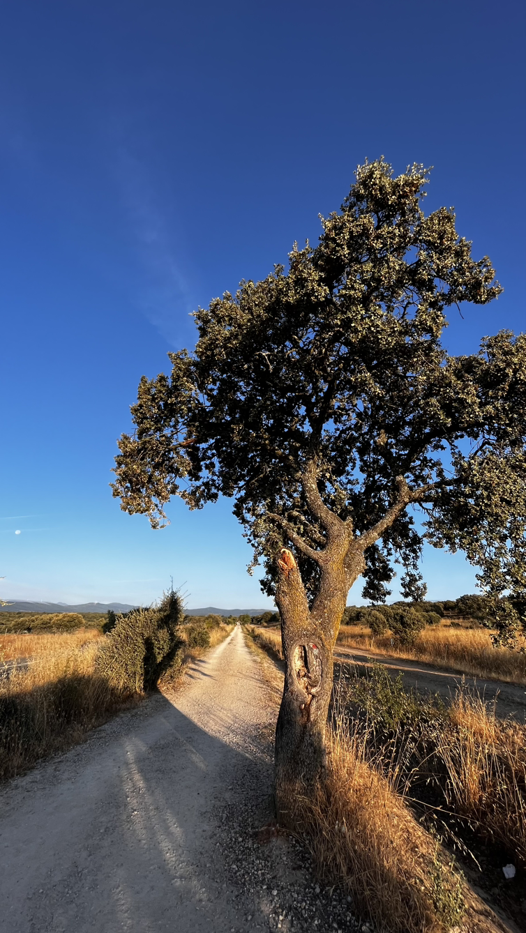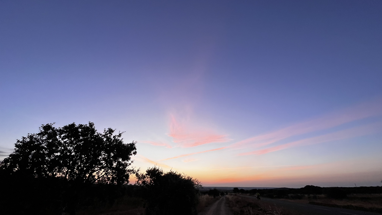 동틀 무렵에 보니 풍경은 딴판이다. 이젠 메세타평원을 완전히 벗어나서 어느새 레온산맥이 성큼 주변을 차지하고 있다. 시골풍경도 황토빛 토지에 나무와 잡풀들이 이제는 한풀 꺾인 더위와 어쩌면 금방 덮쳐올 겨울처럼 한기를 내뿜고 있다.