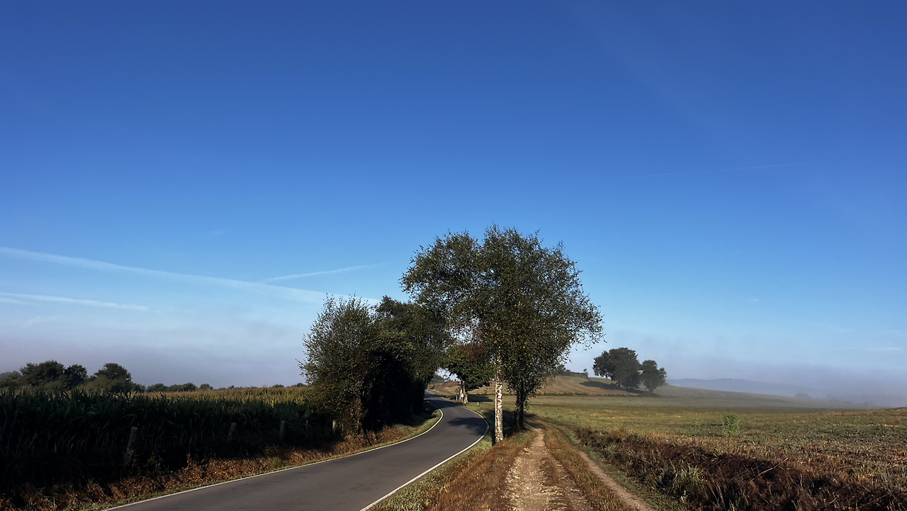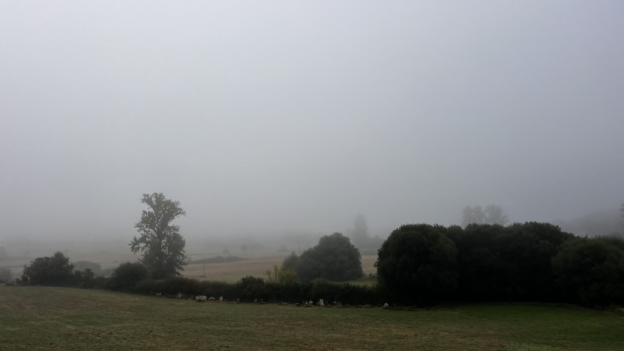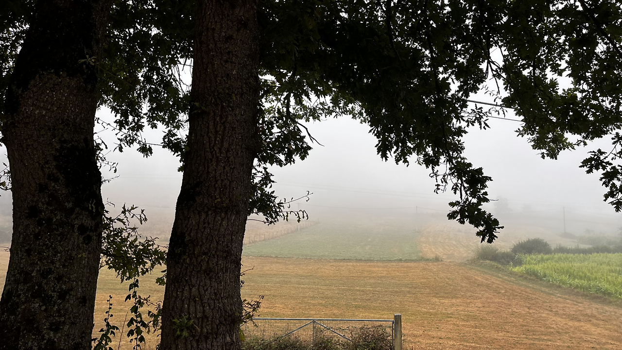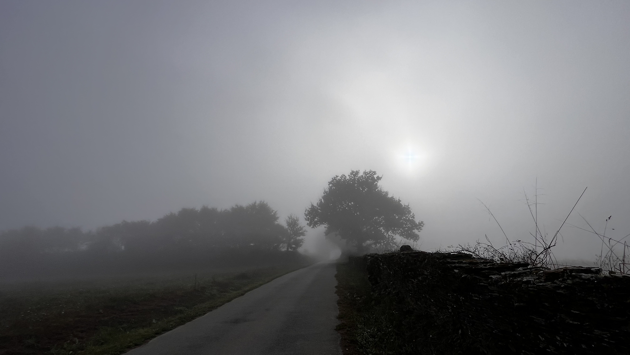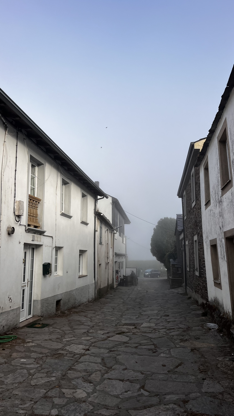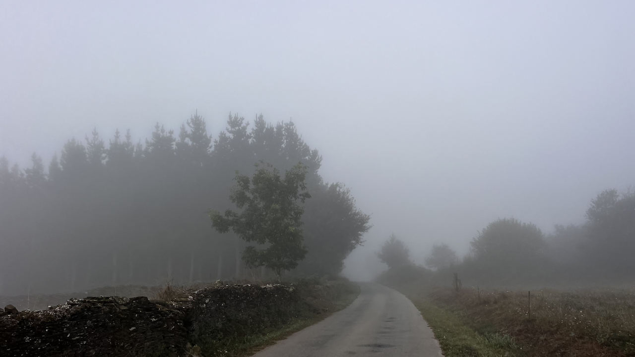 해가 솟았을 9시 이후에, 어쩌다 열린 바에서 크로아상에 진한 아메리카노를 마시고 나오니 마을을 안개가 둘러싸고 있다.