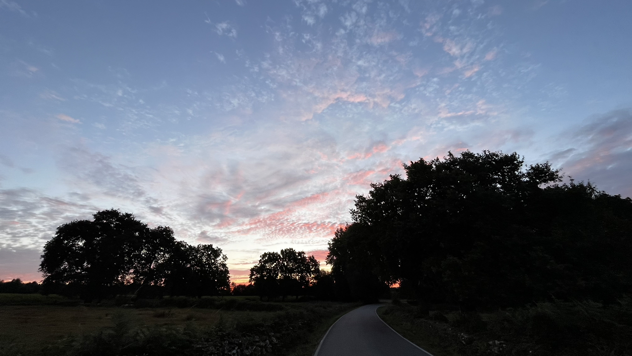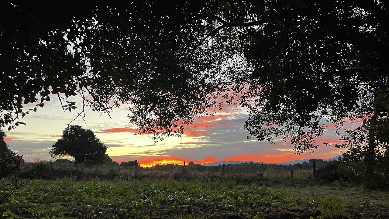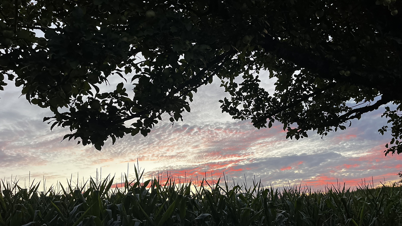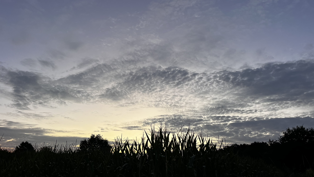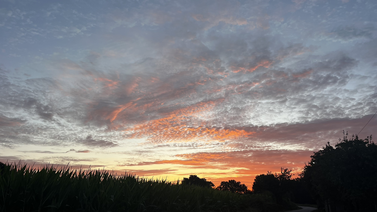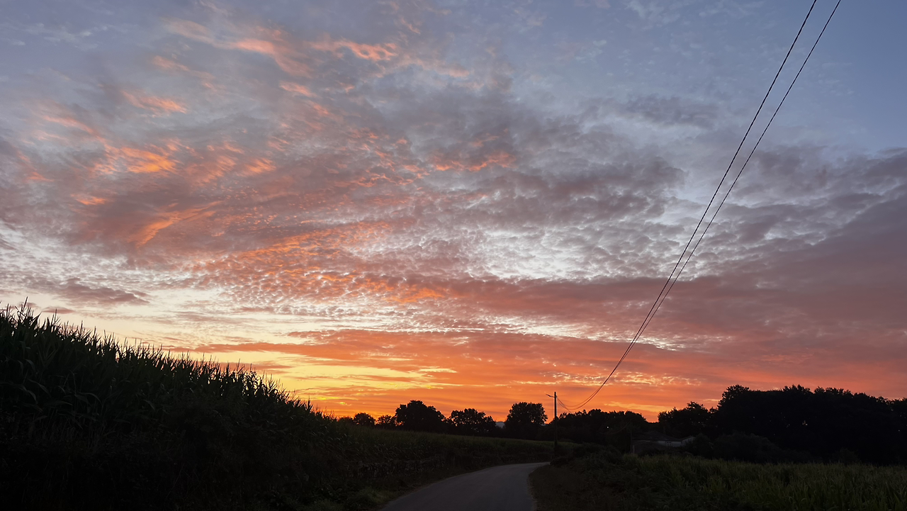 새벽이라 묵묵히들 한참을 걷는데 동이 터오는 하늘이 정말 예술이다. 자꾸자꾸 뒤돌아보며 산위에서, 나무들 사이로, 옥수수밭 위로 붉은 하늘을 담는다.