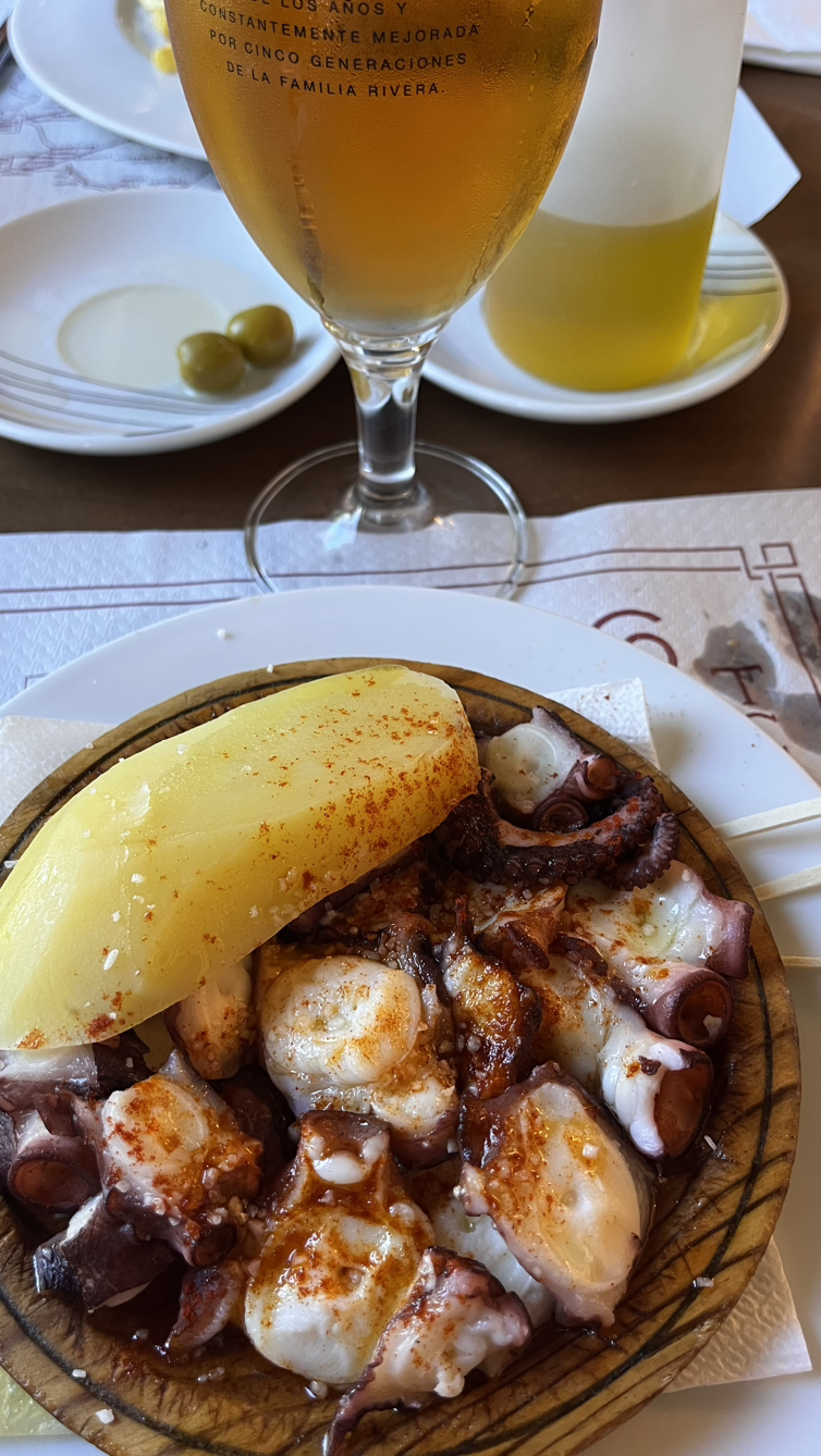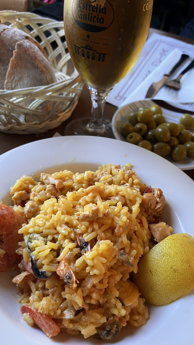 메뉴델디아, 오늘의 메뉴로 보면 되고 대체로 3코스에 와인 또는 물이 제공되며 순례자들이 주로 이용하는 셋트메뉴다,로 빠예야와 어제에 이어 뽈뽀에다 티라미슈케익에 맥주를 마신다. 한잔으로 부족해서 두잔까지 마시고 다시 걷는다.