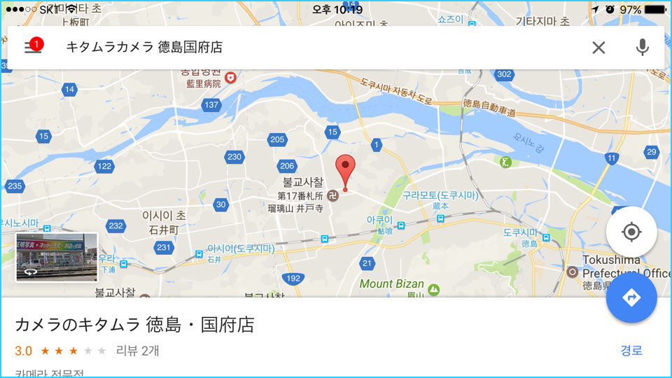 의기소침해 있는 내가 안됐는 지 박선생님이 문제 해결을 위해 애를 쓰신다. 식당 근처의 전파사 같은 곳에다가 카메라 수리점을 문의해서 キタムラカメラ(키타무라카메라) 德島国府店의 전화번호를 알아내신 거다. 구글맵으로 검색해보니 17번 이도지에서 멀지 않기에 이도지 참배 후에 들러보기로 한다.