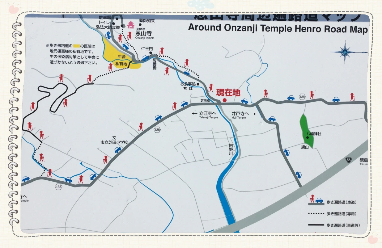 12km니 세 시간을 예상하긴 했는데 10시 반에야 절 근처에 온 듯 '온잔지 주변 헨로 미치 맵'이 눈에 띈다. 아직도 조금 더 가야 하나보다. 결국 10시 50분에 산문을 들어선다.