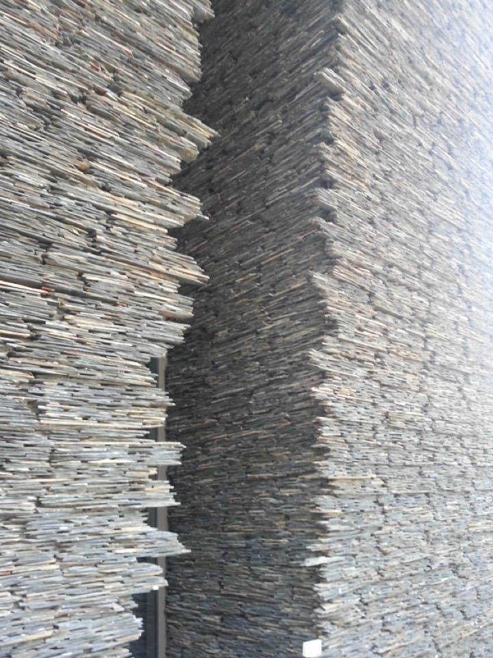 검은흙의 경우 고속도로를 달리면서 땅을 판 지층의 결을 보면서 그것이 아름다워 건축에 쓰고 싶다 생각했던 것이 무모한 작업의 출발이다. 돌기와 경우 하나에 두께 7mm가 채 안 되는 돌(적판암)을 켜켜이 쌓아붙여서 33m 이상 높이 건물의 아트월을 완성한다. 돌을 모두 해체, 블록화해 습식 건식을 반복해 다시 하나하나 붙여 거기서 오는 색감의 변화들로 아트 건축 작품을 만들어나가는 작업이다.