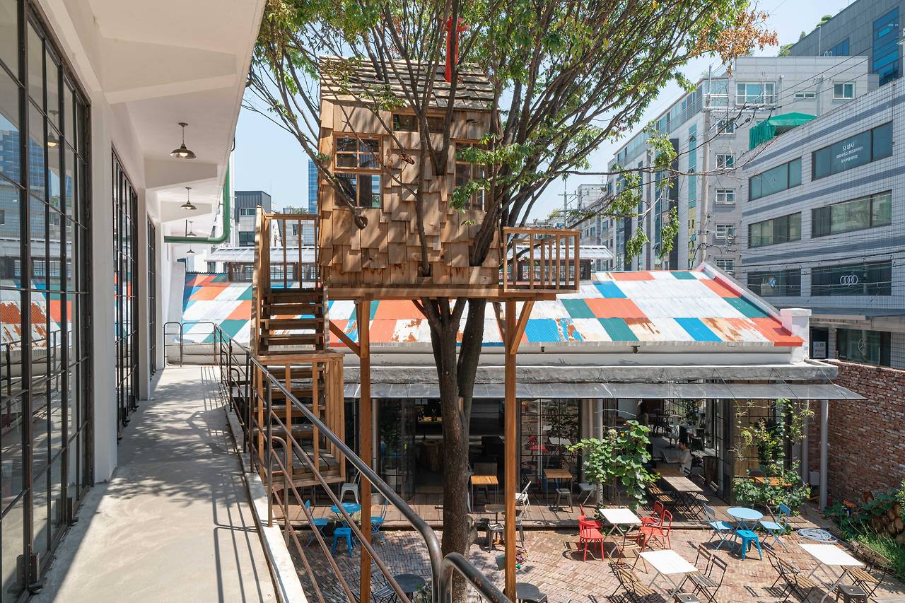 "공장을 헐고 뼈대만 남아있어 임대가 잘 되지 않던 이 터를 보는 순간 5초 안에 완성된 모습이 떠올랐어요. 저는 항상 공간을 보면 미래 그림이 그려지는데 지금 완성된 모습이 바로 그 머릿속 상상이 구현된 것입니다.” 지붕을 다듬고 쓸어내고 보강하고 50년 된 나무 골조는 고스란히 살렸다.