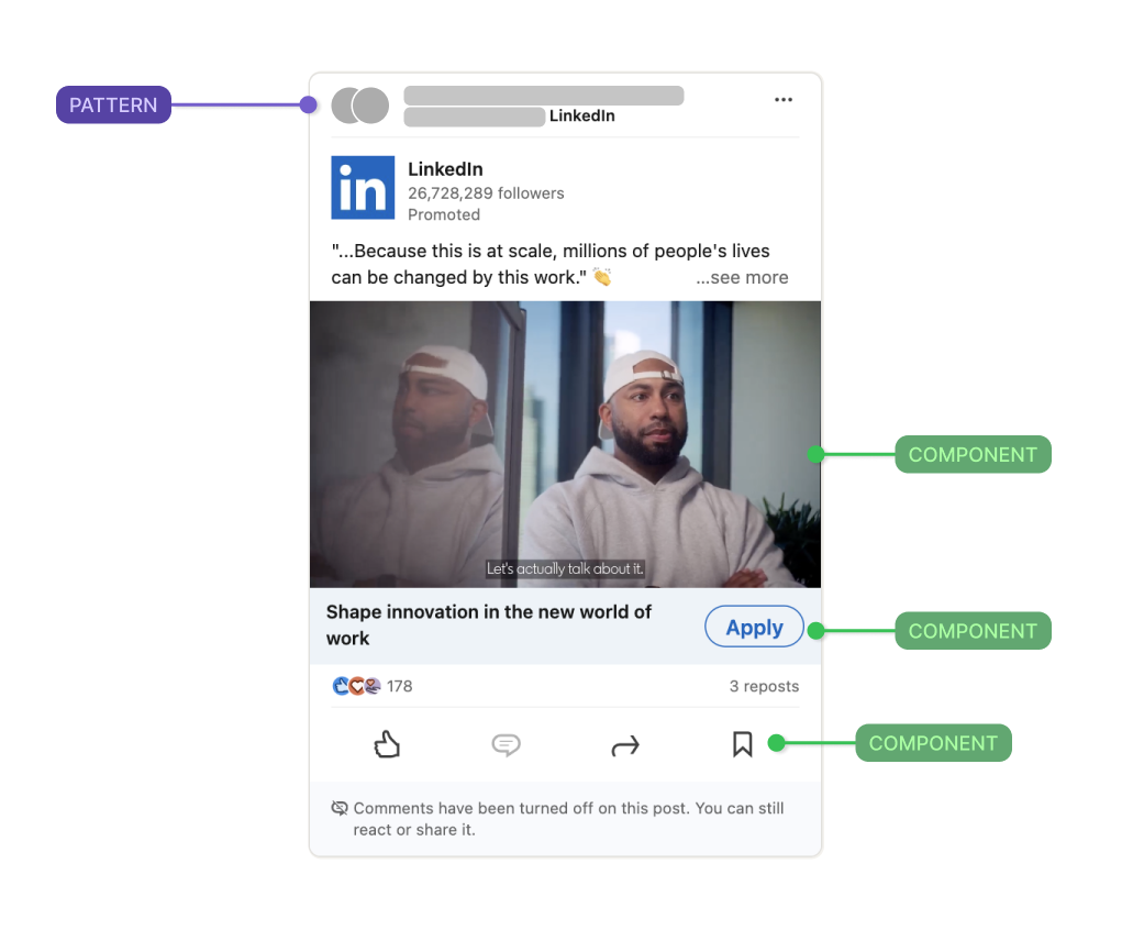구체적인 예시를 보자면, Linkedin에서는 아마 이 프로필 컴포넌트들을 많이 사용할 것 같아요. 저는 임의로 'Hero card'라고 이름을 붙여보았습니다. 아래 이미지를 보고 이해하면 쉬울 것 같아요.