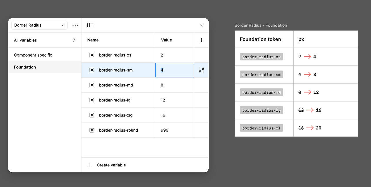 하지만 만약 이미 만들어둔 토큰들이 각 컴포넌트들에 잘 적용되어 있다면 이야기가 달라진다. 컴포넌트에 적용된 모서리의 파운데이션 토큰 (Foundation token)을 X-small에서 Medium 사이즈로 바꿀 수도 있고 아예 Foundation 토큰의 숫자값을 바꿀 수도 있다.