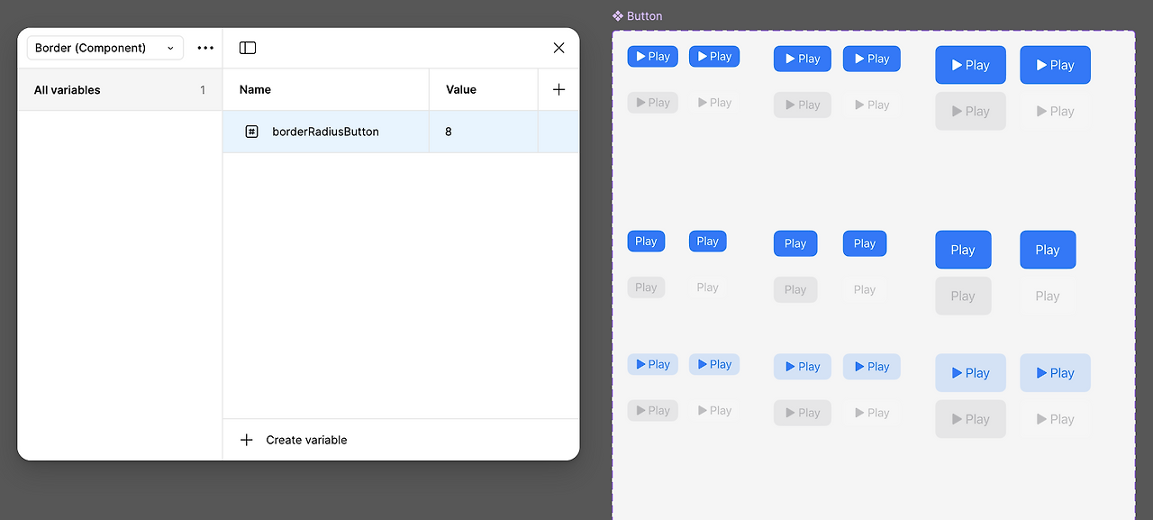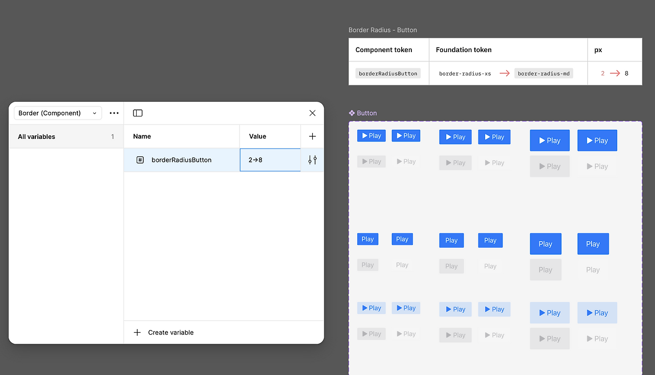 버튼 컴포넌트의 모서리 곡률 토큰에 해당하는 컴포넌트 토큰(Component token)에 적용된 파운데이션 토큰(Foundation token)을 border-radius-xs(2px)에서 border-radius-md (8px)로 바꾸는 것이다. 코드에서는 엔지니어가 컴포넌트에 해당하는 파운데이션 토큰을 위 그림의 테이블에 적힌 내용과 같이 바꾸면 되지만 현재 피그마에서는 만들어 둔 Variable의 숫자를 바꾸는 방법으로 가능하다.