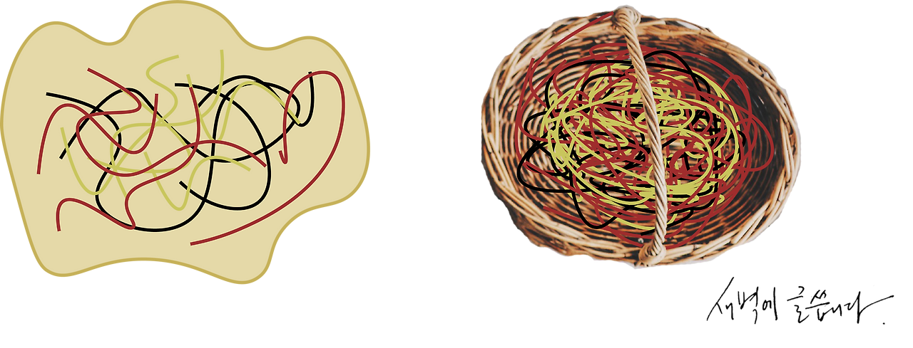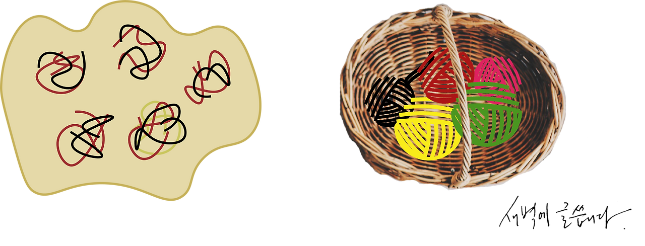 그런데 열을 가해 달걀을 익히면 어떻게 되는 걸까요? 그 바구니를 강하게 흔든다고 생각해보시면 됩니다. 뭉쳐있던 털실, 즉 각각의 단백질이 펴집니다. 펴지는데 왜 단단해지냐고요? 주변 분자들과 상호작용이 증가하기 대문입니다. 털실들이 다 풀린채로 바구니 안에서 서로 꼬여 큰 실타래를 이루는 장면을 생각해보시면 됩니다. 훨씬 덩어리져있죠?