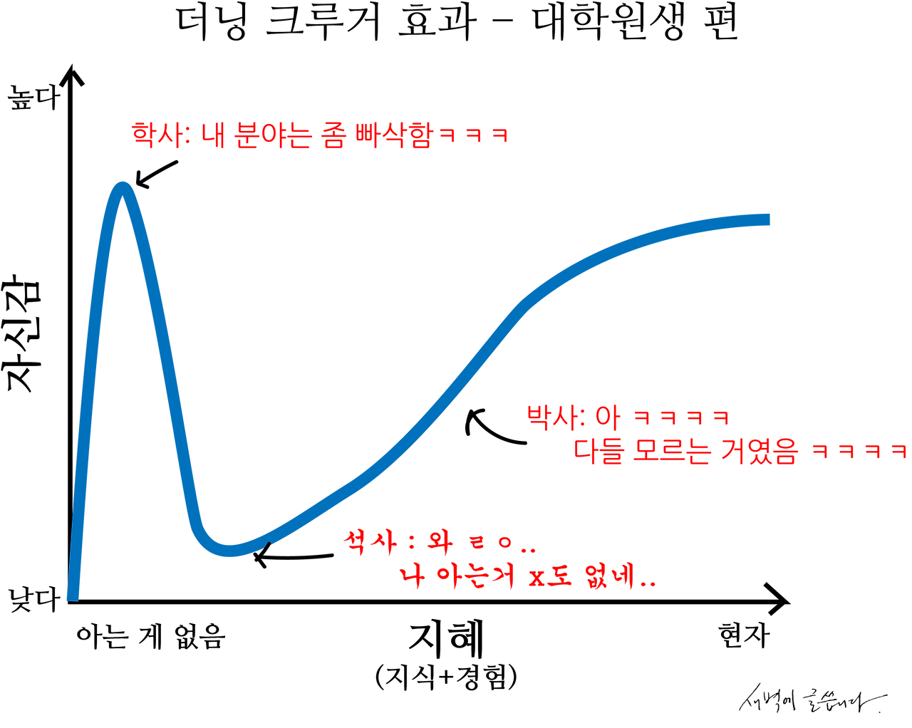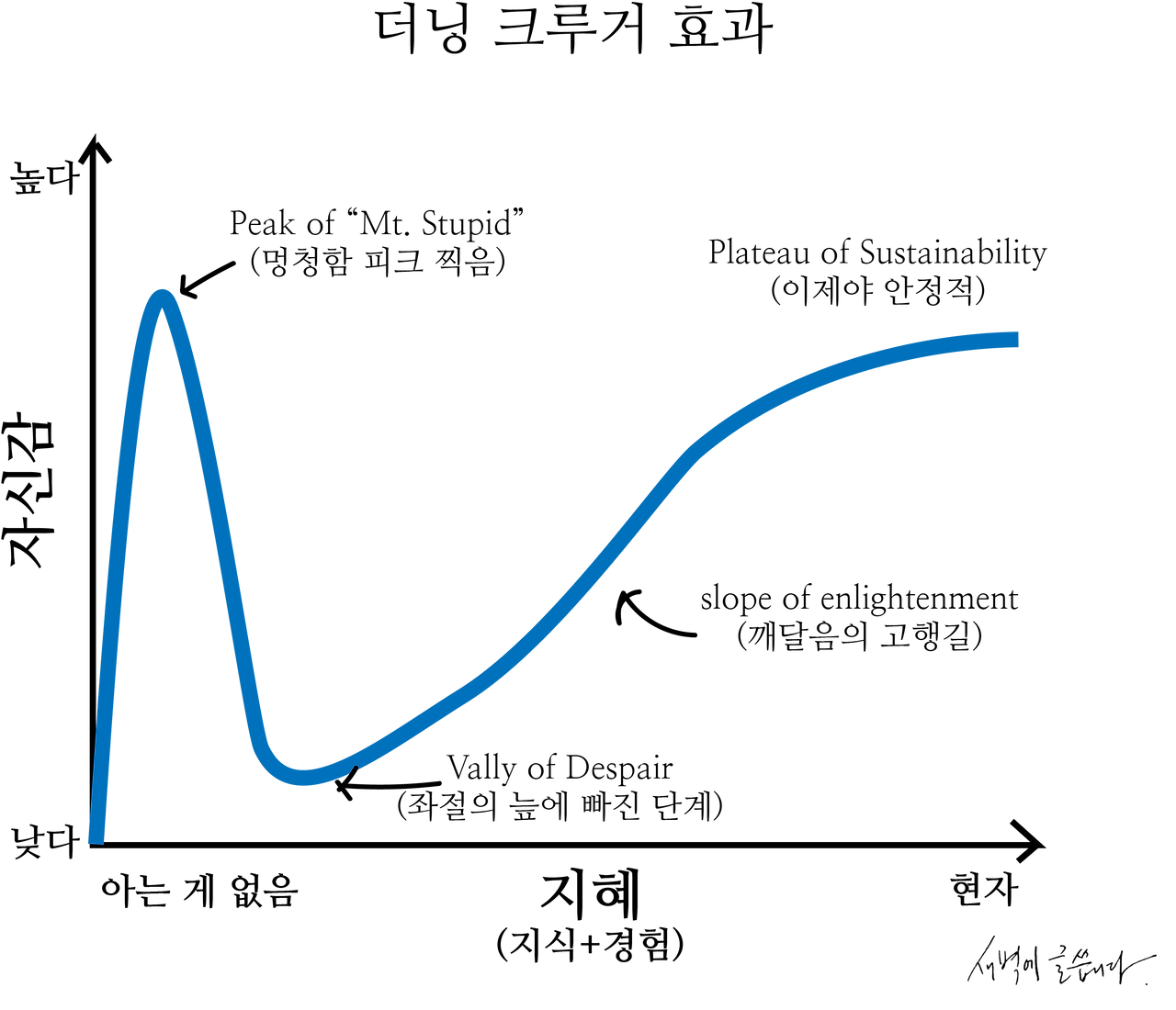 아주 아무것도 모르는 사람은 자신감을 가질 일도 없겠지만, 조금 아는 사람들은 이 분야의 모든 걸 이해한 것처럼 자신감의 정점을 찍게 됩니다. 그러나 더 알게 되면, 도리어 내가 모르는 게 많았다는 걸 깨달으며 자신감이 감소합니다. 알면 알수록 스스로가 얼마나 모르는지를 더 깨달으며 좌절의 늪으로 빠져들어갑니다.