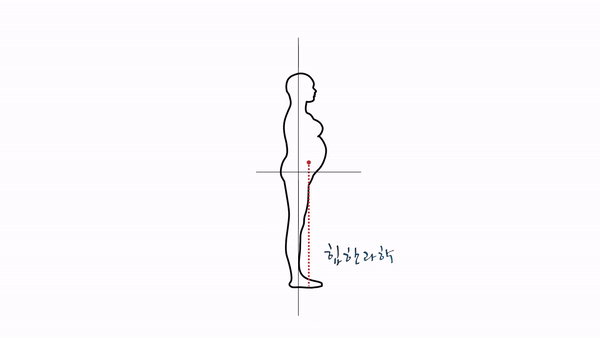그런데 무게 말고도 다른 문제점이 있습니다. 만약 6.8kg 더 무거워지고 튀어나온 배를 가지고 임신하지 않은 상태처럼 서있는 자세를 물리적으로 따져보면 앞으로 회전력을 받아 고꾸라지게 되기 때문입니다. 튀어나온 배 때문에 무게중심이 몸 안이 아닌 몸 앞에 있게 되기 때문입니다. 따라서 발을 축으로 임신부의 몸이 앞쪽으로 회전하게 됩니다. 즉, 임신하기 전처럼 서있는다면 임신부는 매 순간 앞으로 엎어질 위험에 처해 있는 셈이죠.