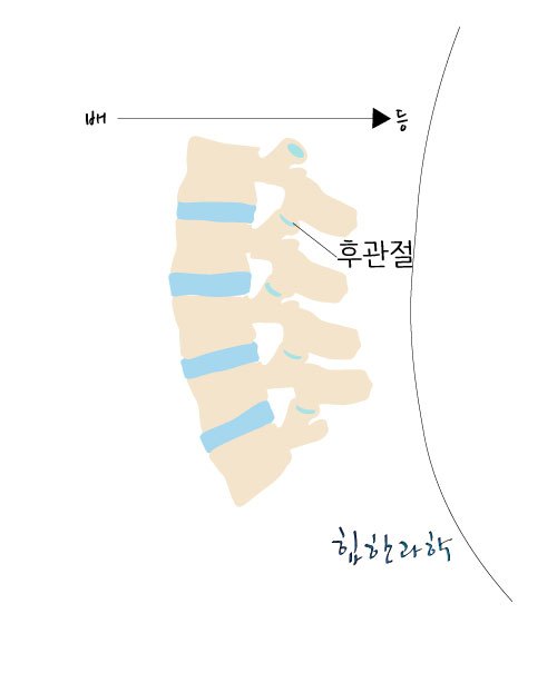 그런데 이 자세는 허리에 굉장히 무리를 많이 줄 겁니다. 특히 등과 가까운 쪽 척추 관절을 많이 누르게 되겠죠. 이 부분을 ‘후관절(Facet Joint)’라고 부릅니다.