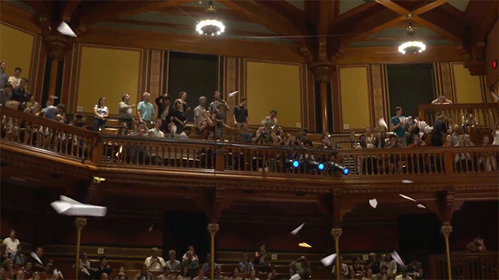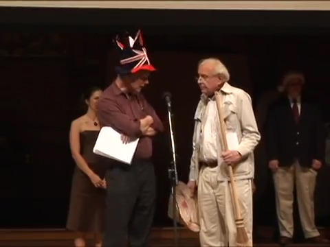토론에 참여했던 로이 글라우버는 20년 이상 이그노벨상 시상식에서 굉장히 중요한 역할을 맡았습니다. 바로 청소부입니다. 아래 사진에서 보시다시피, 삿갓을 쓰고 빗자루를 들고 종이비행기를 쓸어냅니다. 묵묵히 빗자루를 휘젓는 그는, 수상소감을 하는 사람이 있든 말든 자신의 역할을 다하는 진정한 프로였습니다.