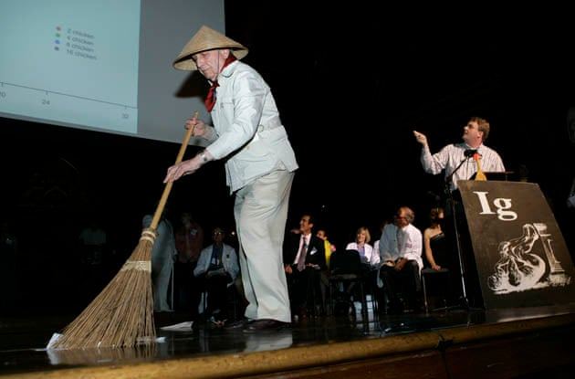 시상식에서 이런 사건이 일어났던 이그노벨상은 노벨상의 패러디입니다. 매년 하버드 대학교의 샌더스 극장에서 공식적으로는 매년 10개 부문 한번 웃고, 그다음 생각하게 만드는 연구에 상을 수상합니다.