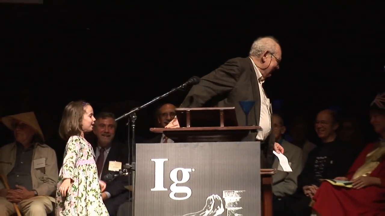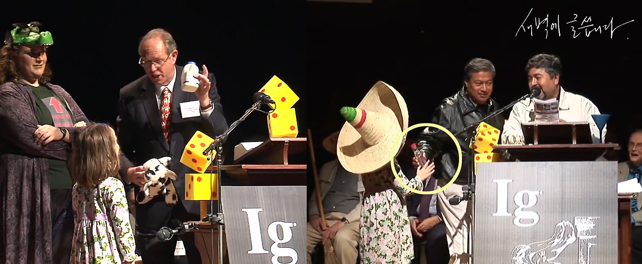 그런데 이렇게 제한해도, 제한시간을 넘기는 사람들이 종종 있기 마련입니다. 그렇지만 이그노벨상 시상식에서는 아무도 이길 수 없는 무기를 사용합니다. 바로 ‘귀여움’입니다.