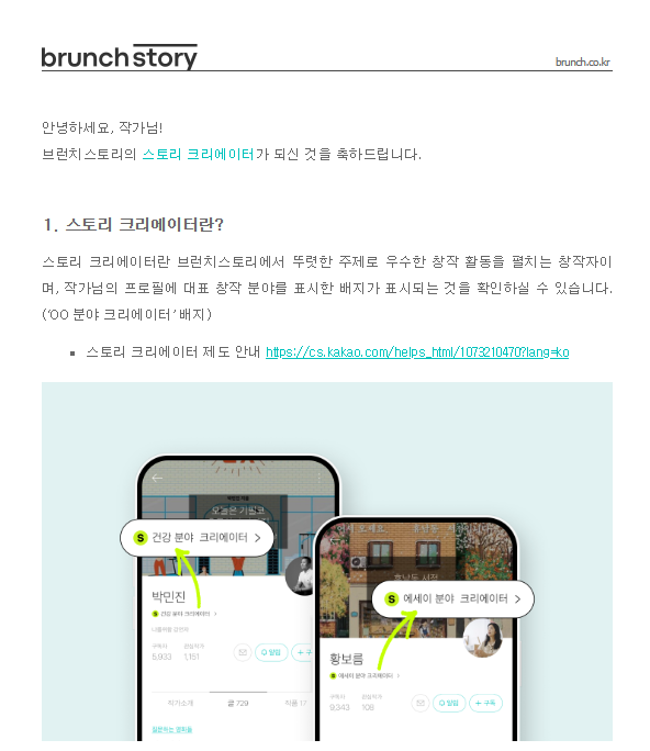 어제 점심시간 바로 전인 11시 47분경 메일이 도착했다. 휴대폰에 메일 알림이 떴는데 제목은 [브런치스토리 '스토리 크리에이터' 선정 및 응원하기 이용 안내]라고 떴다. 이게 뭘까 싶어 바로 들어가 확인을 했다. 메일은 짧았다. “스토리 크리에이터가 되신 것을 축하드립니다.” 메일 서문의 이 문장이 유난히 오래 길게 읽혔다.