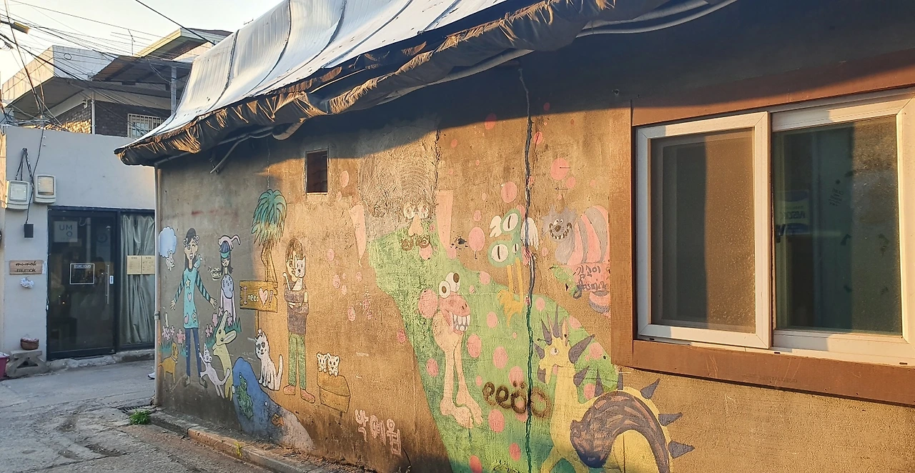 문래창작촌에 들어서자 80년대로 걸어 들어가는듯한 기분을 느꼈다. 옛 서울의 정취가 골목 구석구석 아직까지 보존되고 있는 곳이다. 건물들 대부분이 단층에 갈색 새시 문을 달고 있다. 기와지붕에 방수포를 덮어놓은 곳도 종종 보인다. 이곳은 일제강점기에 직물공장촌이었던 탓에 물레에서 유래한 ‘문래’가 동네 이름이 되었단다.