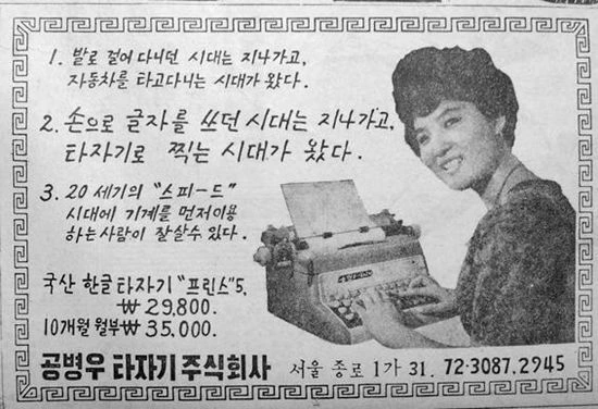 그 옛날에는 신식이었을 신문 광고에 으흐흥 웃음이 난다. 손과 타자기를 발과 자동차에 비유한 광고 문구가 꽤나 설득력 있다. 20세기는 '스피-드' 시대여서 기계를 선점해야 잘 살 수 있는 시대였구나. 10개월 할부로 사려면 무려20%의 이자를 내야 했던, 만만치 않게 비싼 기계였구나.