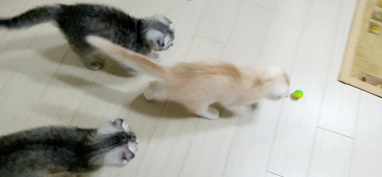 엄마의 통제에서 벗어나 조금씩 자기 영역을 탐구해가는 꼬맹이들. 이제 불린 사료도 먹고, 불리지 않은 엄마 사료도 맛보면서 성장해간다. TV와 리모컨을 차지하고, 내 책을 밟아가면서 진지하게 세상을 탐색하는 아기들이다. 공 하나를 던져 주면 메시와 호날두 저리가라는듯 우당탕탕 경기를 벌인다.