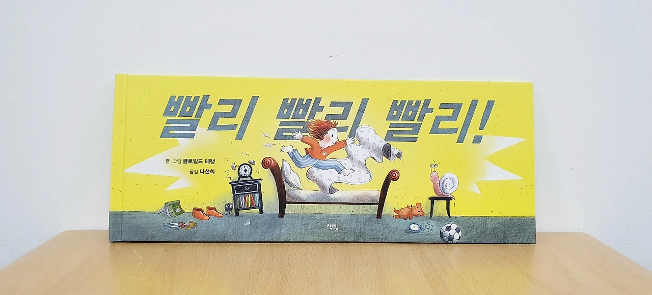 그림책을 보자마자 샛노란 색깔과 판형에 시선을 사로잡혔다. 가로는 엄지에서 새끼손가락을 벌린 만큼의 두 배이고, 세로는 손바닥 끝에서 새끼손가락까지의 길이밖에 되지 않아 가로로 길쭉한 모양이다. 표지 그림은 침대를 박차고 허둥대는 아이와 물건들로 어지러운데, 그중에서도 알람이 울리고 재깍거리는 두 개의 시계가 눈에 띈다. 지면의 삼분의 이를 차지할 만큼 큰 책 제목은 《빨리 빨리 빨리!》다.