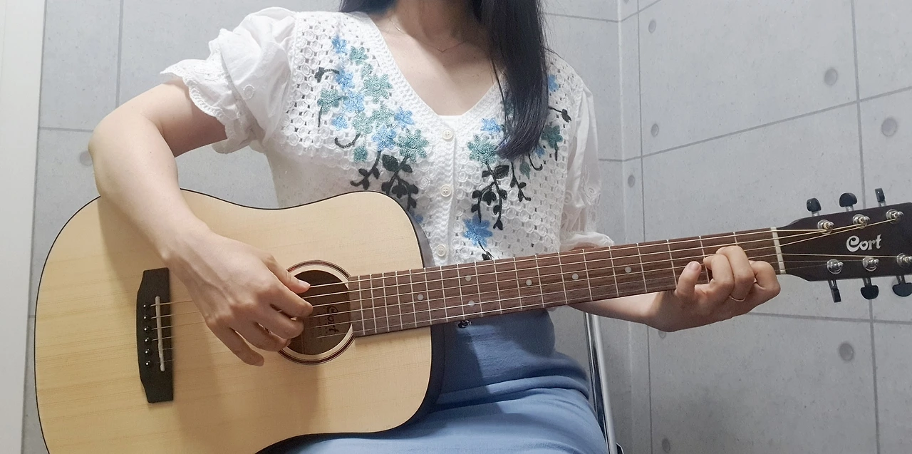 그리고 다가온 수업 시간, 떨리기는 마찬가지였지만 연습 시간이 길었던 만큼 다른 날보다는 자신이 있었다. 아르페지오 주법을 무사히 지나고 천천히 연주를 이어나갔다. 앞부분 연주를 잘했다고 하셨는데 스트로크 부분에서 선생님은 “F 코드 스트로크는 Fm7 코드로 하기로 했죠?”라고 하시며 악보를 가리켰다.