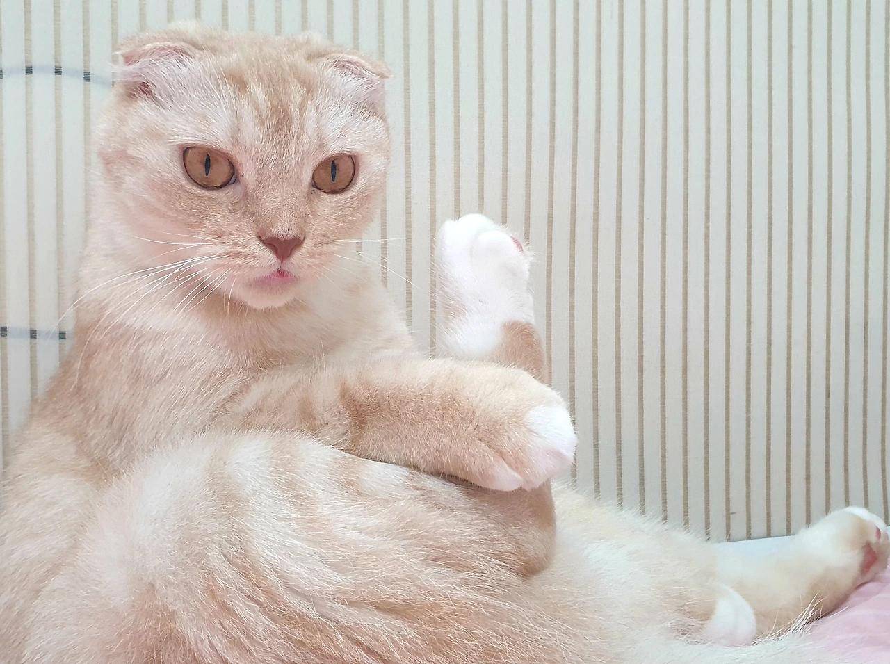 또 다른 시그니처 자세는 바닥에 등을 대고 배를 드러낸 채 네 발에 힘을 뺀 만사태평 자세다. 이 자세를 하고 있을 때면 고양이는 특유의 예민한 감각 스위치를 아예 내려놓은 것 같다. 배에 얼굴을 묻고 들숨날숨을 몰아쉬거나 하염없이 부벼도 태연하게 자세를 유지하는 걸 보면.이때는 평소에 만지면 싫어하던 발을 조물락거리는 것까지 허용된다. 고양이들이 이 집에서 편안하게 지낸다는 반증인 것 같아서 이 자세가 반갑다.