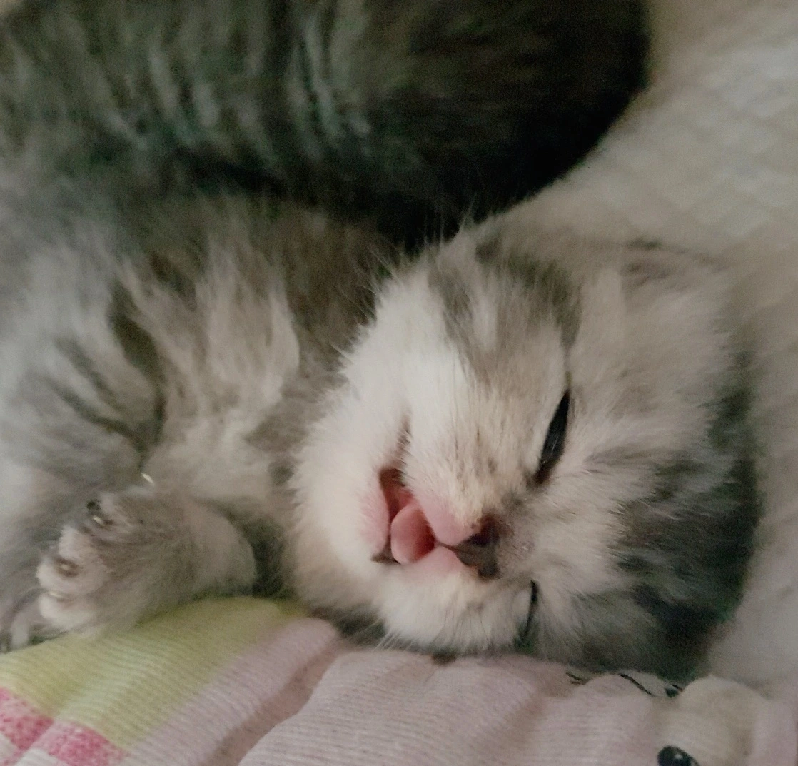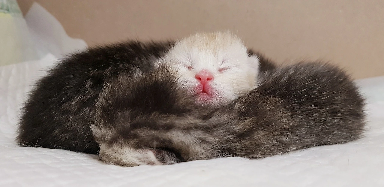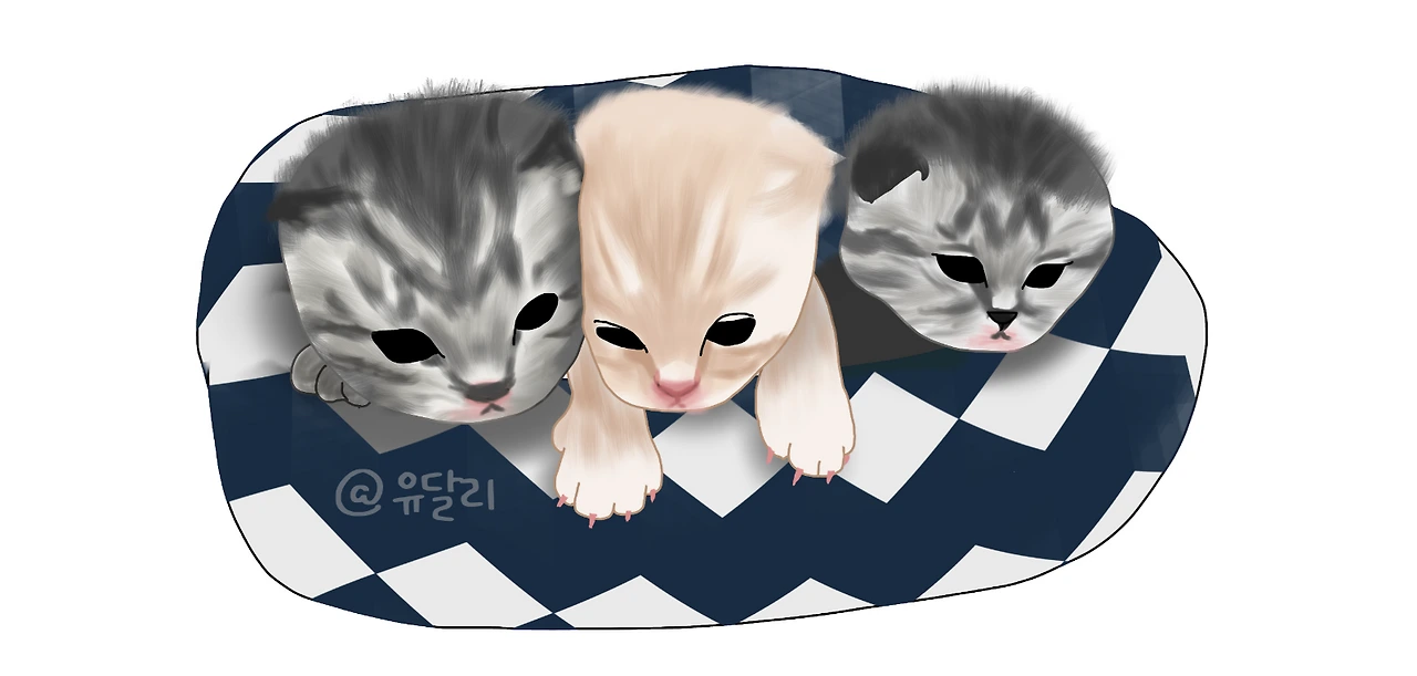 갓 태어난 아기들은 엄마의 그루밍과 타월 마사지로 물기를 닦아내니 제법 고양이 태가 났다. 털이 보송보송해지고, 눈은 뜨지 못한 채 코부터 입 주변까지 짙은 핑크빛이었다. 쁘악쁘악하고 아기새처럼 울었다. 두 마리는 거의 구분이 되지 않았는데, 짙은 회색 바탕에 태비가 보이고 한 마리는 쿠키보다 옅은 베이지 색이었다. 피부가 투명할 정도로 작은 아기들, 꼬리는 꼭 쥐꼬리 같았고 발에는 실낱같은 연약한 발톱이 어설프게 달려 있었다.