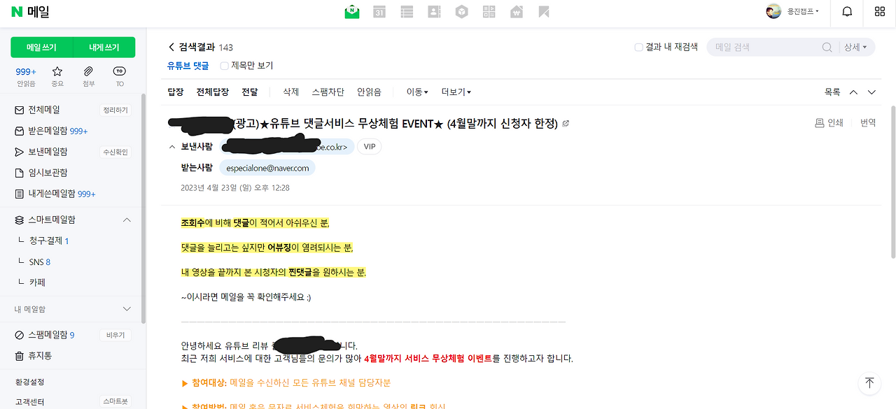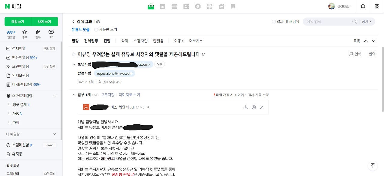 유튜브를 운영하고 있는 내게도 이런 종류의 메일이 계속해서 오고 있지.
