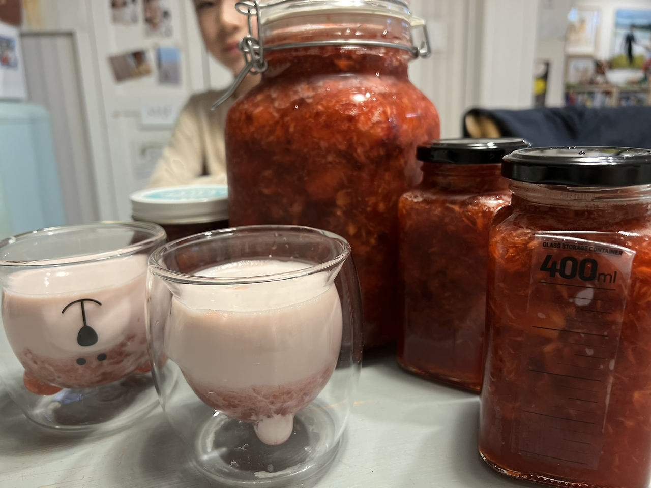 강에게 감기가 옮았는지 어제부터 나도 열이 나기 시작했다. 하지만 딸기의 골든타임을 잘 살려야 했기 때문에 누워있을 수 없었다. 물 빠진 딸기의 꼭지를 칼로 베어 낸 다음 열심히 으깨어 사탕수수가루를 녹이고 그 위에 올리고당 막을 씌워 냉장고에 넣었다. 글은 단 몇 줄인데 과정은 많은 시간과 고된 노동을 요했다.