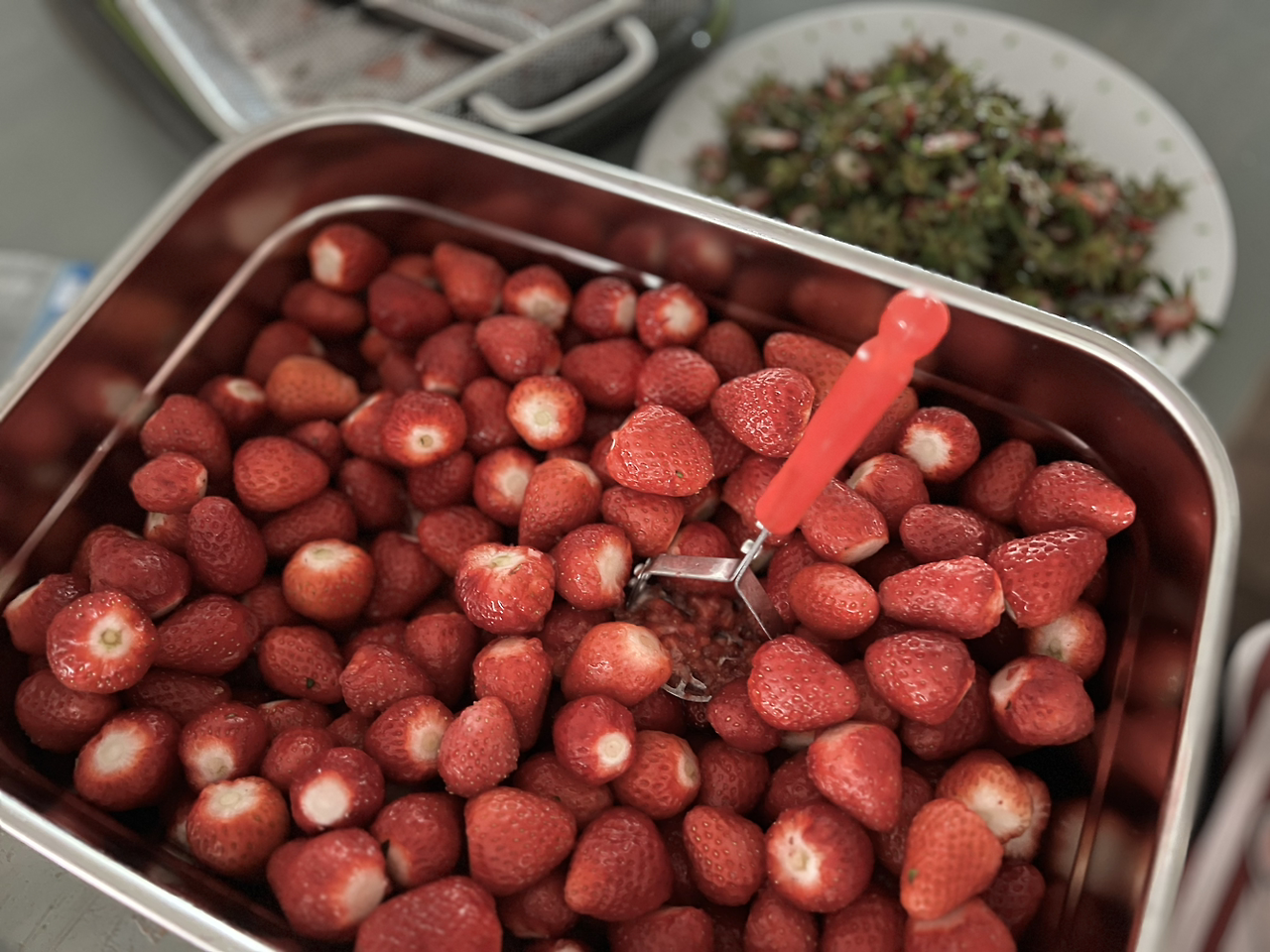 딸기는 좀 더 까다롭다. 과육이 물러 닦을 수 없으니까. 깨끗이 씻은 딸기는 실온에서 물기가 빠질 때까지 기다려줘야 한다. 그렇다고 다음 날 해버리면 물러지고 썩어 절반은 베어 버려야 하니 적정 시간 내 다 해야 하는 것이 중요하다.
