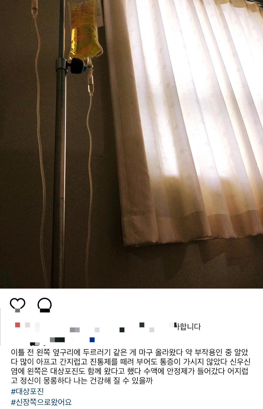 오늘 아침 눈을 떴는데 아픈 옆구리 통증으로 최근 나의 건강 상태를 돌이켜 보았다. 부종과 발열, 옆구리 통증. 그 때와 비슷한 것으로 보니 신장이나 방광에 문제가 생긴 것 같다. (그땐 소변을 못 눴는데 지금은 그 지경은 아닌 걸 보니 대상포진은 아닌가 보다.)
