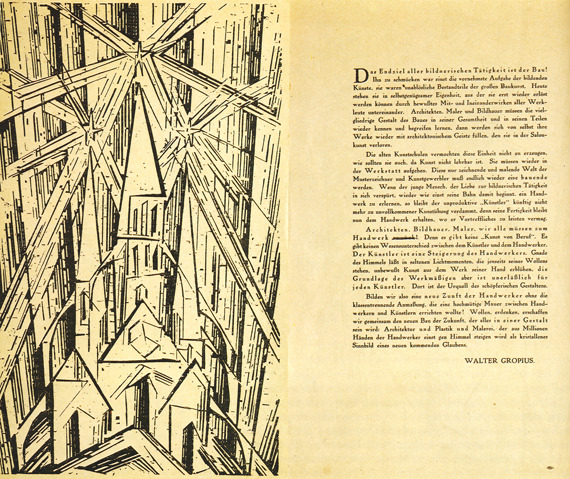 모든 조형미술의 궁극적인 목표는 건축에 있다. 그러나 오늘날 미술은 고립상태에 있다. 미술이 이와 같은 고립상태에서 벗어날 수 있는 길은 오로지 모든 공예가들과의 적극적인 협력을 통해서만 가능하다. 모든 미술가들에게는 공예의 숙련이 필수적이다. 그 속에 창조적 상상력의 근원이 있는 것이다.