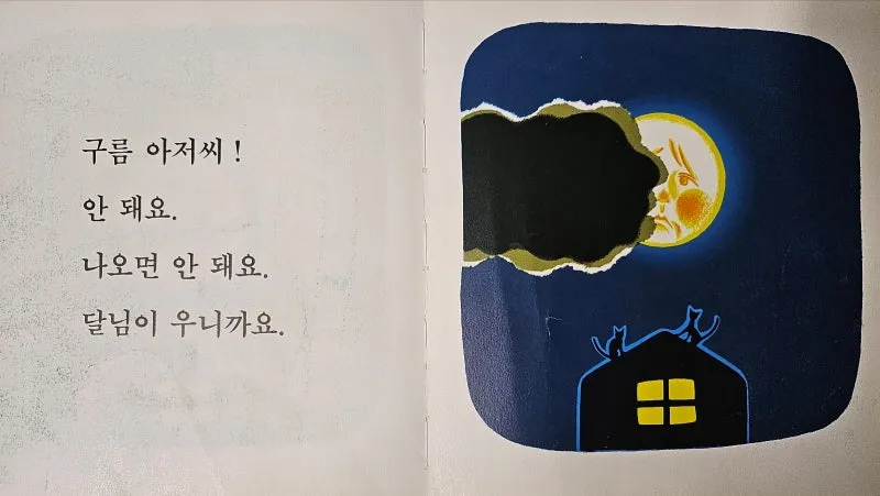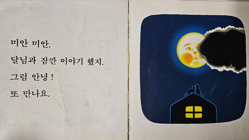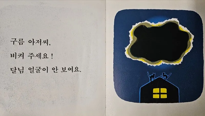 스토리는 단순했다. 반가운 달님이 떴는데 구름 때문에 잠시 사라졌다가 다시 나온다는 이야기. 지붕 위에 앉아있는 두 마리의 고양이의 모습을 보는 것도 재미있는데 달이 가려지는 순간 놀라는 몸짓을 하는 고양이의 모습이 아이를 더 긴장하게 했다. 마지막 환하게 웃고 있는 달님 아래로 두 마리의 고양이가 나란히, 엄마와 아이가 나란히 있는 모습에 휴~ 하고 마음을 놓게 되는, 짧은 이야기 안에 기, 승, 전, 결이 다 들어있다.