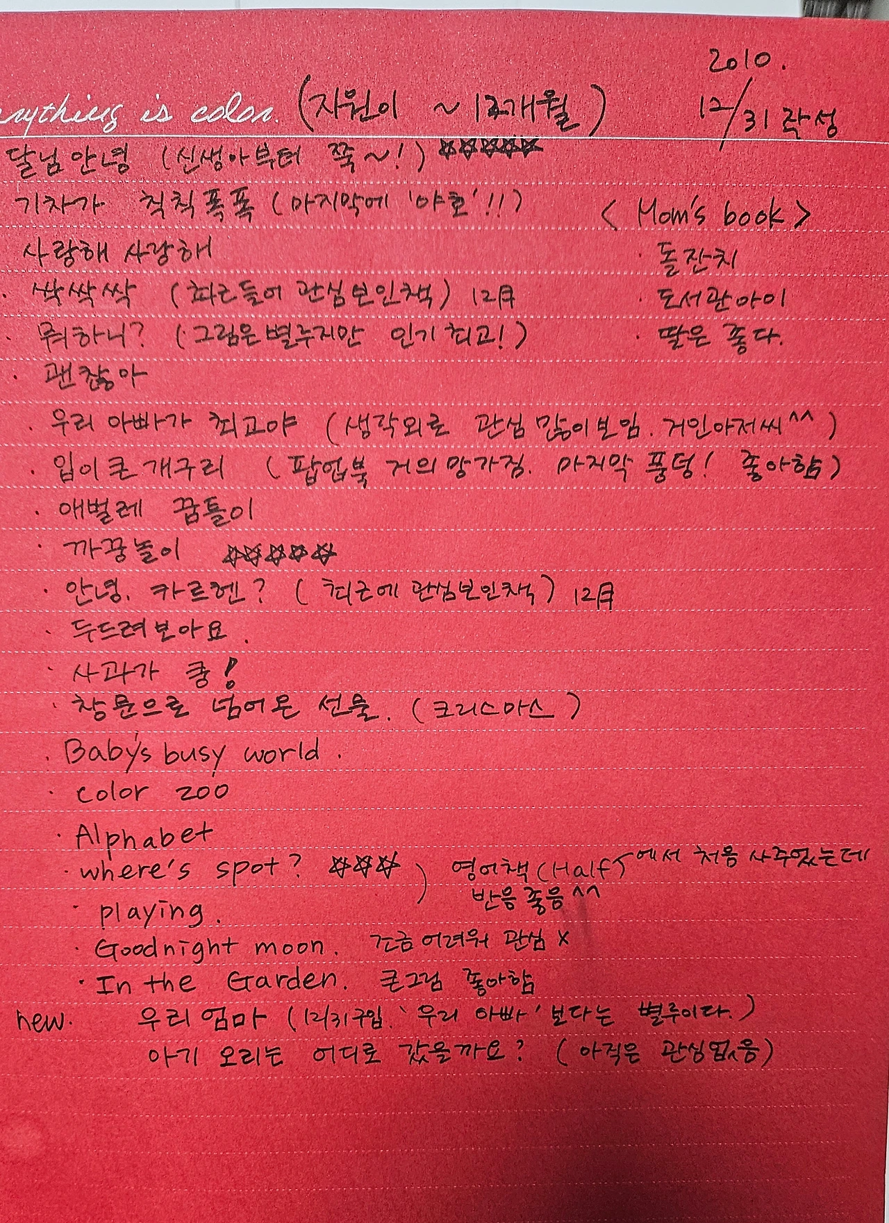 지금 나에게 중요한 건 물론 달의 의미는 아닐 것이다. 2010년부터 아이와 함께 읽은 책의 목록이 빼곡히 적혀 있는 노트를 한 장, 한 장 보면서 ‘이럴 적이 있었지.’ 지난 추억을 꺼내 보고 있다. 나도 30대 시절이 있었고, 신생아 아가를 키우는 초보 엄마일 때가 있었다는 것.(지금도 서툴지만^^) 옹알옹알 말하던 귀여운 아가가 이제는 친구 같은 딸로 성장했다는 것이. 그 시간이 아득해진다. 공책에 적힌 문장을 읽으며 딸을 불렀다.