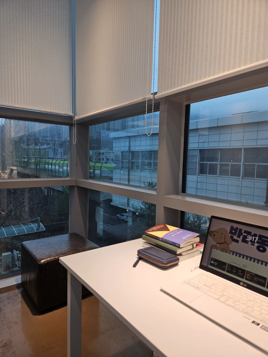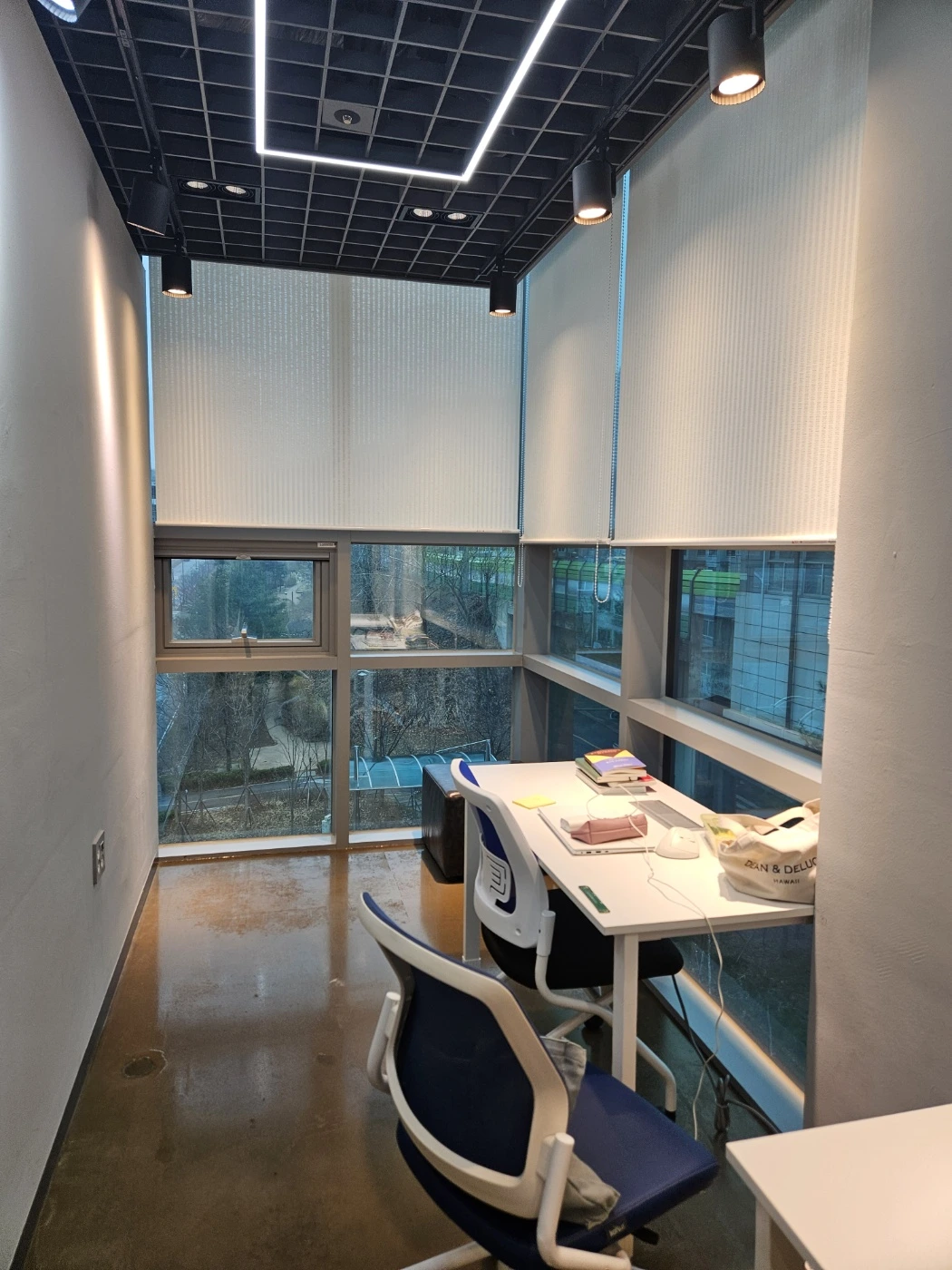 최근에야 2인 작업실을 이용하기 시작했다. 네이버에서 간단하게 예약할 수 있었다. 개인 스터디 용도가 아니라 창업에 관한 작업을 한다면 나이에 상관없이 이용할 수 있다고 한다. 막상 이용해 보니, 개인 작업실처럼 편했다. 책상 두 개, 의자 두 개 딱 필요한 것만 있었지만, 이게 어딘가. 통창으로 밖이 훤하게 보이고 혼자 조용하게 있을 수 있다는 것만으로 만족스러웠다. 노트북, 책, 노트, 충전기, 커피를 담은 텀블러, 약간의 간식을 챙겨 일주일에 두 번 정도 갔다. 오전 시간은 여유로웠다. 공간을 사용하는 사람이 거의 없었다. 하루 4시간까지 이용가능해 글쓰기 특강 자료를 준비하고, 글도 쓰고, 메모도 하면서 4시간을 꽉 채웠다. 방음은 잘 안되어 옆 방에서 누군가 전화하는 소리가 그대로 들리긴 했지만.