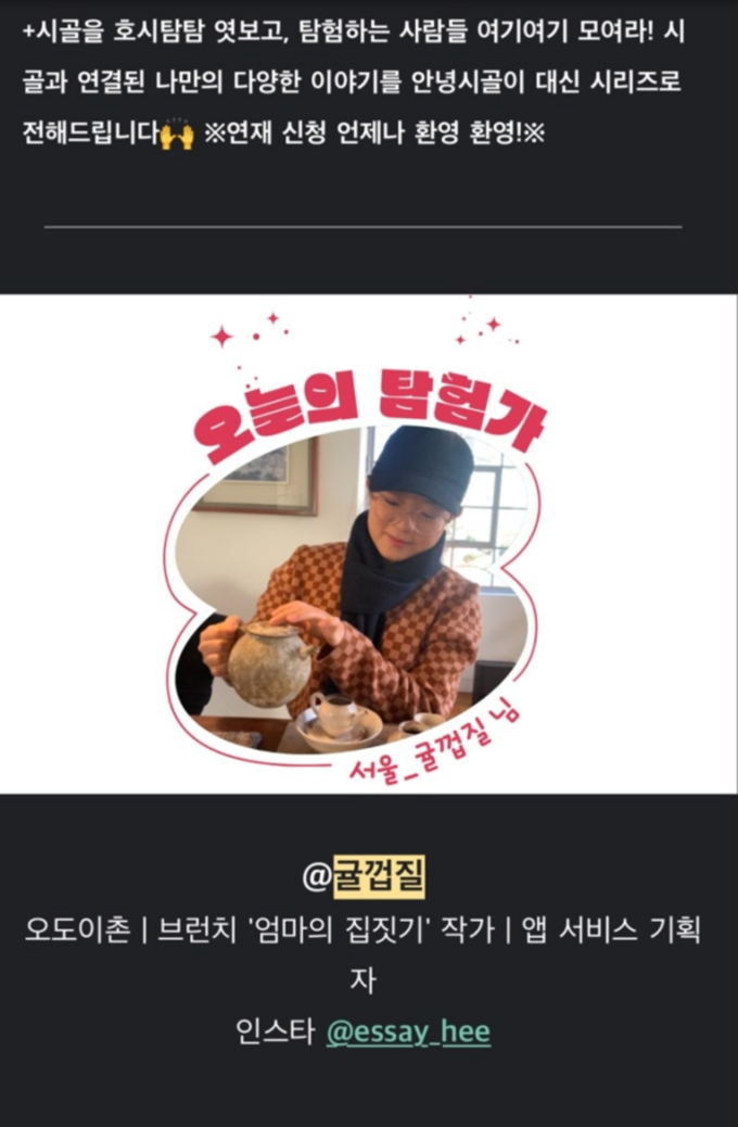 브런치 글 중 4편의 글을 선정하여 기재했는데요. 시골살이에 관심 있는 사람들이 꽤나 많고, 다양한 시골 체험과 살이의 기회가 있다는 걸 알게 되었습니다. 또 브런치 외부 플랫폼에서도 작가로서 인정을 받은 기분이 들어 뿌듯했습니다.