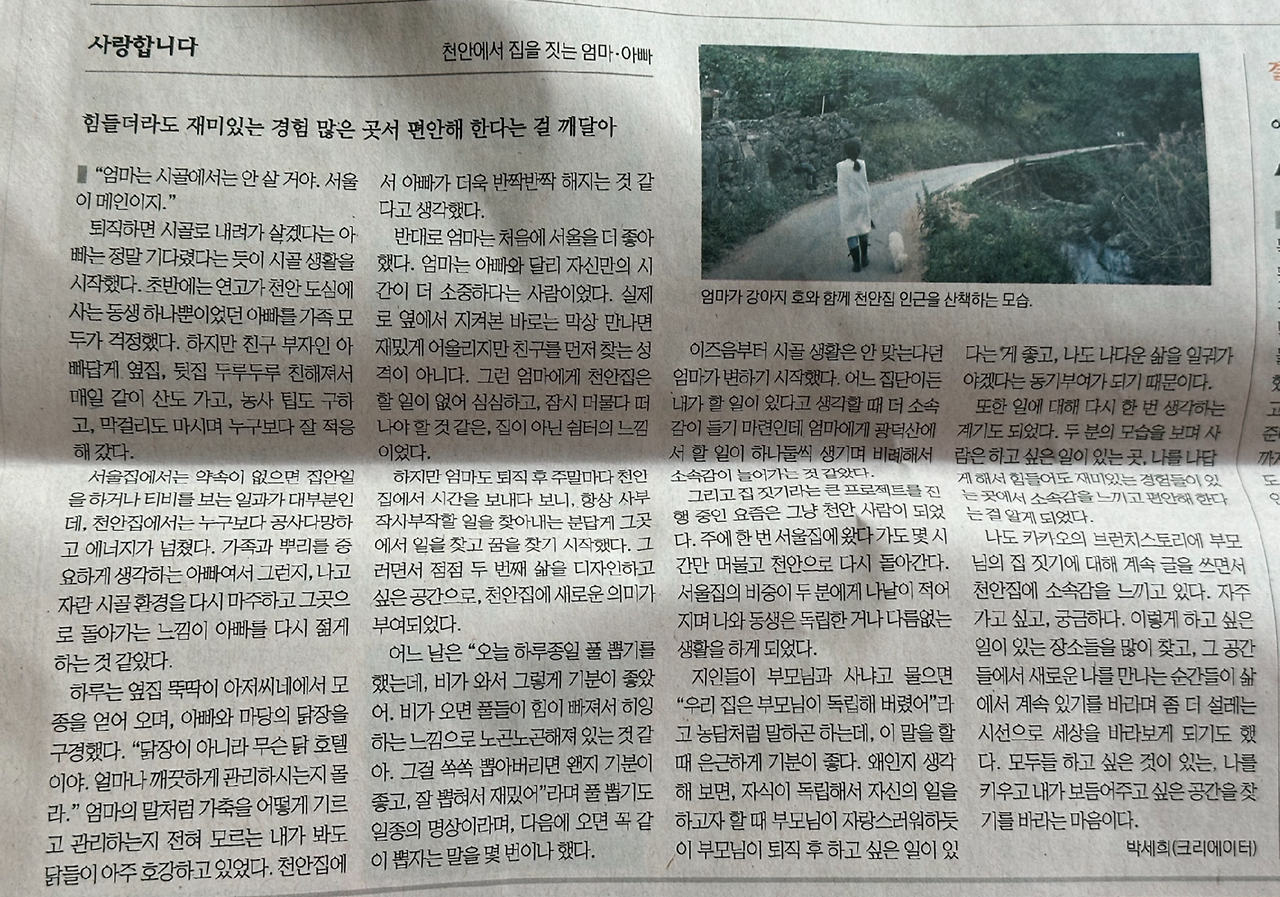 부모님처럼 건축탐구집 애청자인 분들에게 우리의 스토리를 전달할 좋은 기회였죠. 또한 전문가분들이 제작해 주신 선명한 화질과 탄탄한 스토리의 영상도 남길 수 있었습니다. 저절로 글쓰기 참 잘했다는 마음이 들었습니다.